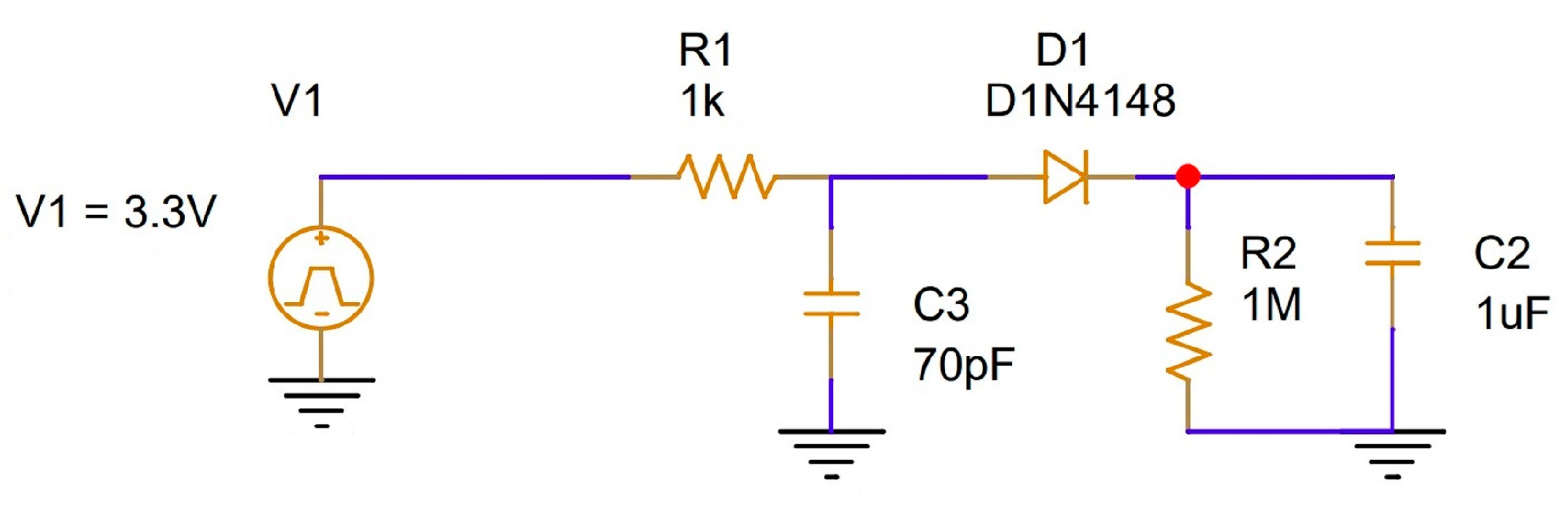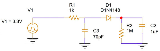 Subsequently, the signal from the filter is directed to a peak detector, which converts alternating current (AC) to direct current (DC). The triangular output signal from the low-pass filter was fed into the half-wave rectification circuit, which consisted of a 1N4148 diode connected in series to produce a DC signal. To improve the signal and reduce the ripple, a 1 MΩ resistor is connected in parallel with a 1 µF capacitor. The ends of the resistor and capacitor are connected to the grounding electrode. The series connection of the diode prevents the full discharge of the capacitor when the signal has low voltage, causing the capacitor to discharge only through the 1 MΩ resistor. This resulted in a discharge time constant of one second, providing a reliable and stable measurement of soil water content that can be fed into an analog input of the microcontroller to provide the percentage water content in the soil.