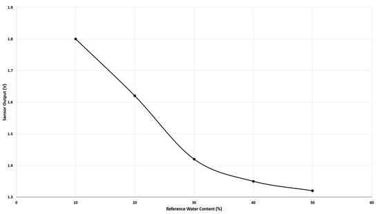Specifically, for a water content of 10%, the output voltage of the sensor is 1.8 V, and for a content of 50%, the voltage decreases to 1.32 V. This inverse relationship suggests that the sensor can detect changes in soil moisture, providing lower voltages for higher water content. The voltage line shows a steady decrease as the water content increases, confirming the sensitivity of the sensor to changes in moisture. The practical detection limit of the proposed device is estimated at around 60%, beyond which the measurements become less reliable due to signal saturation. Beyond this range, the output voltage approaches the lower detection limit of the system, making it difficult to distinguish further increases in water content.