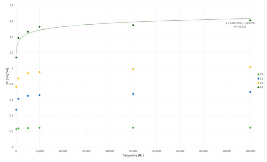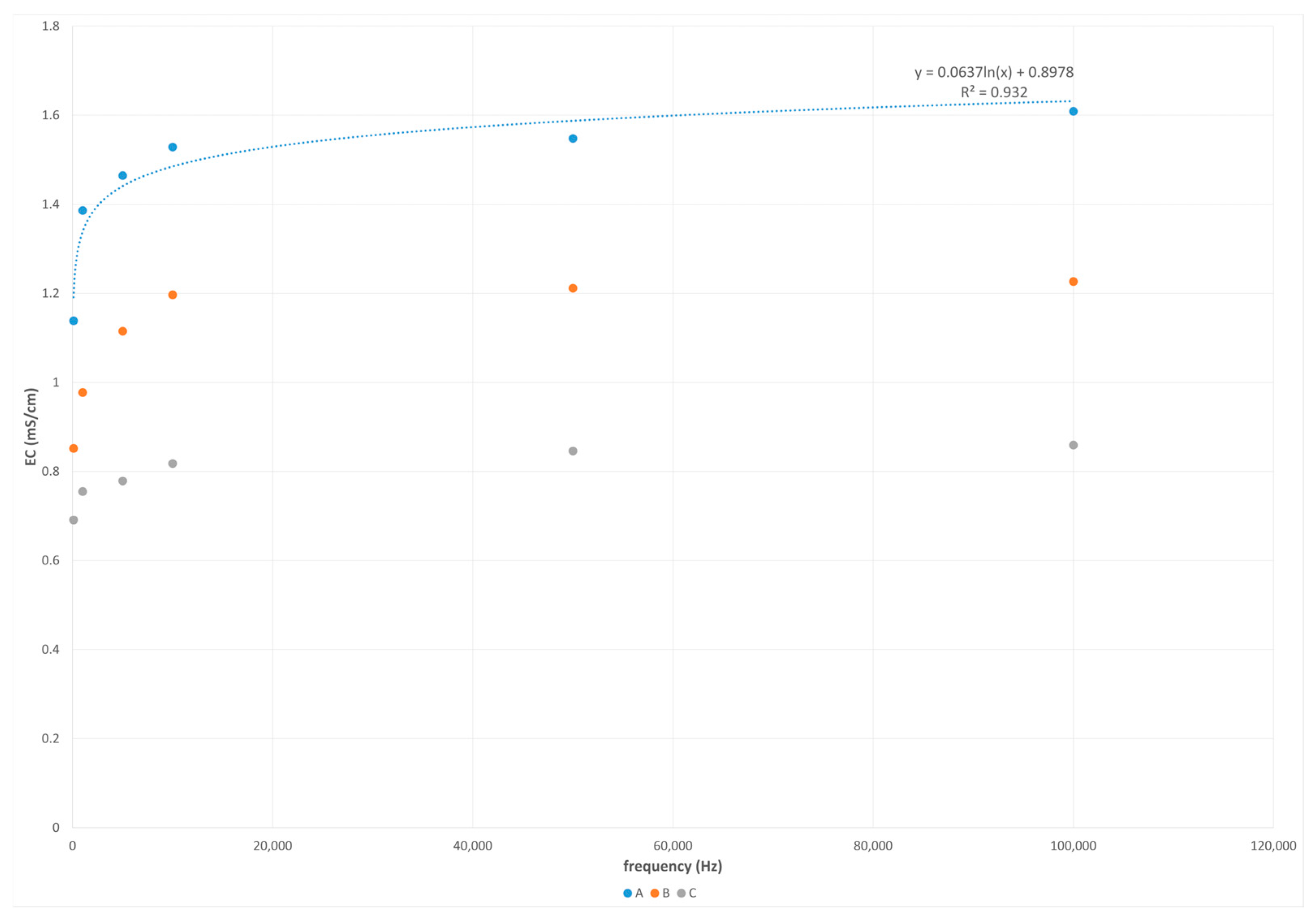 Figure 18 presents the relationship between EC (mS/cm) and frequency (Hz) for three measurement sets (A, B, and C) at a salt concentration of 0.4 M. For dataset A, the logarithmic trend line achieved a coefficient of determination of R