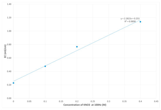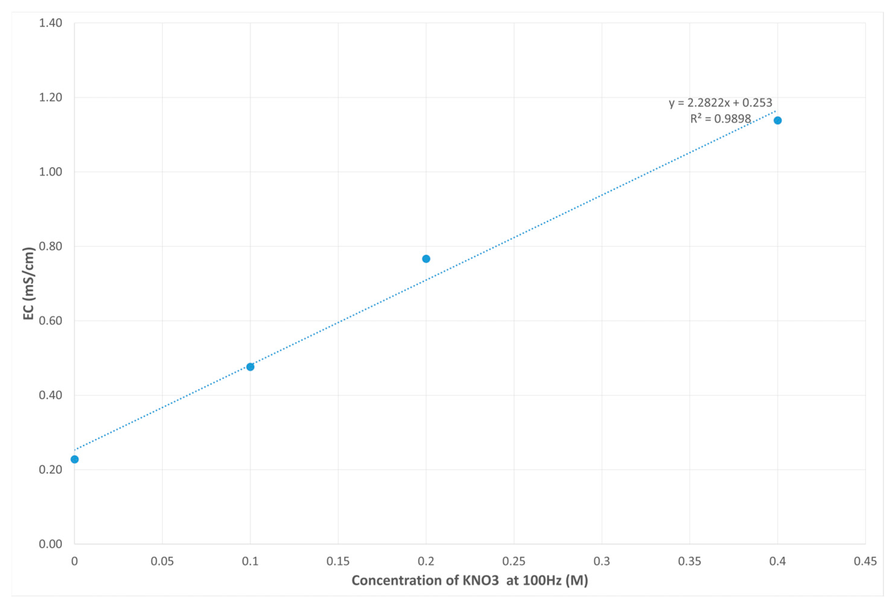 EC increased linearly with KNO3 concentration at 100 Hz, as confirmed by the trend line equation, highlighting the strong influence of salt concentration on solution conductivity.