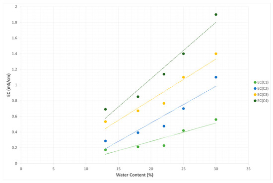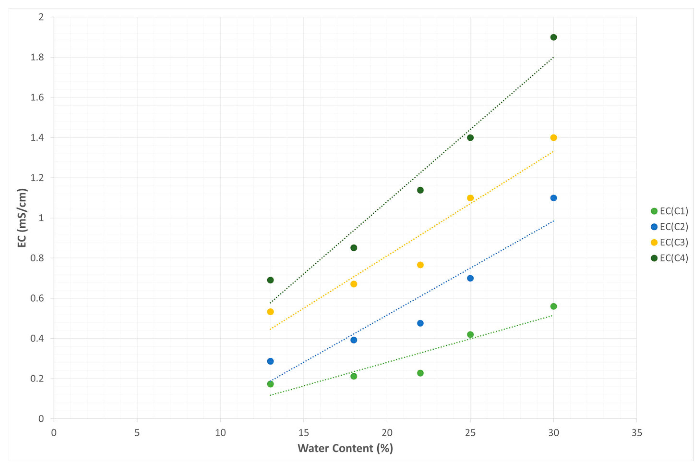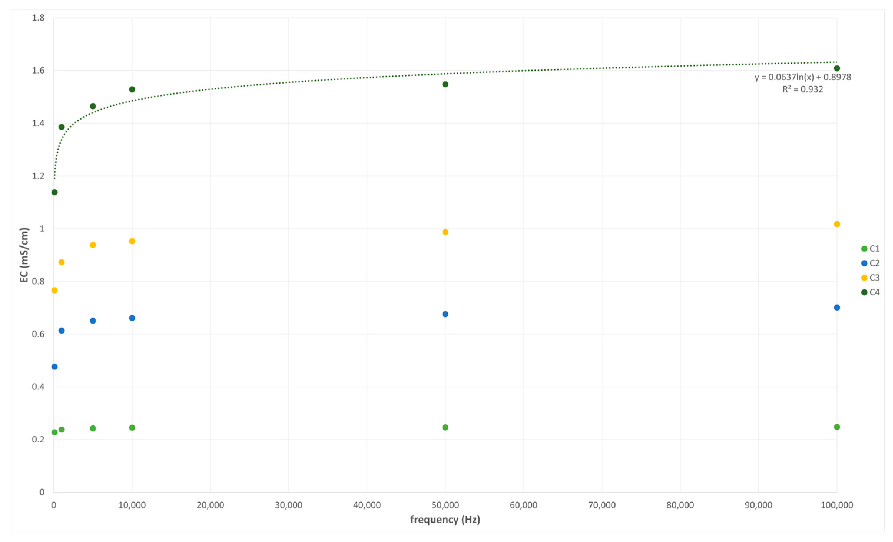 Figure 17 illustrates the relationship between electrical conductivity (EC, mS/cm) and frequency (Hz) for four salt concentrations (C1–C4) at a water content of 22%. An algorithmic trend line fitted to the C1 data yielded a coefficient of determination of R