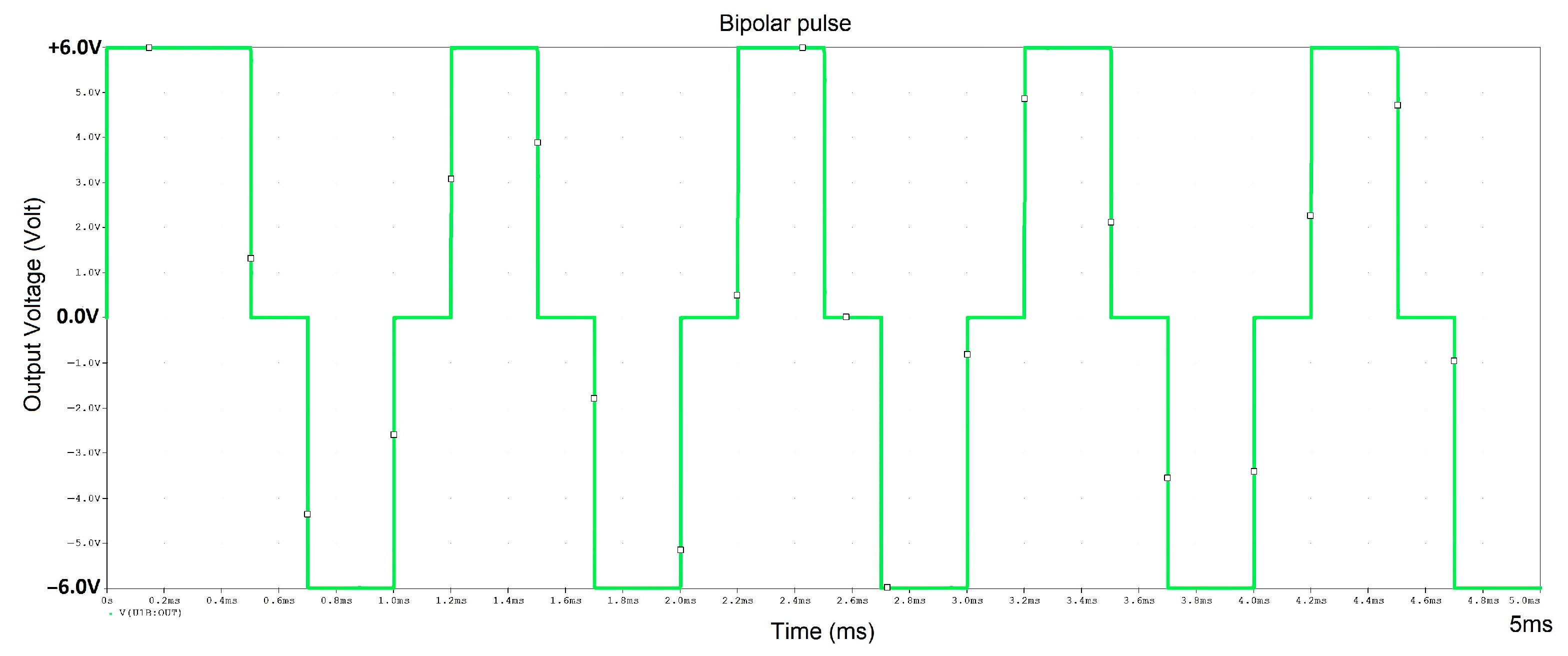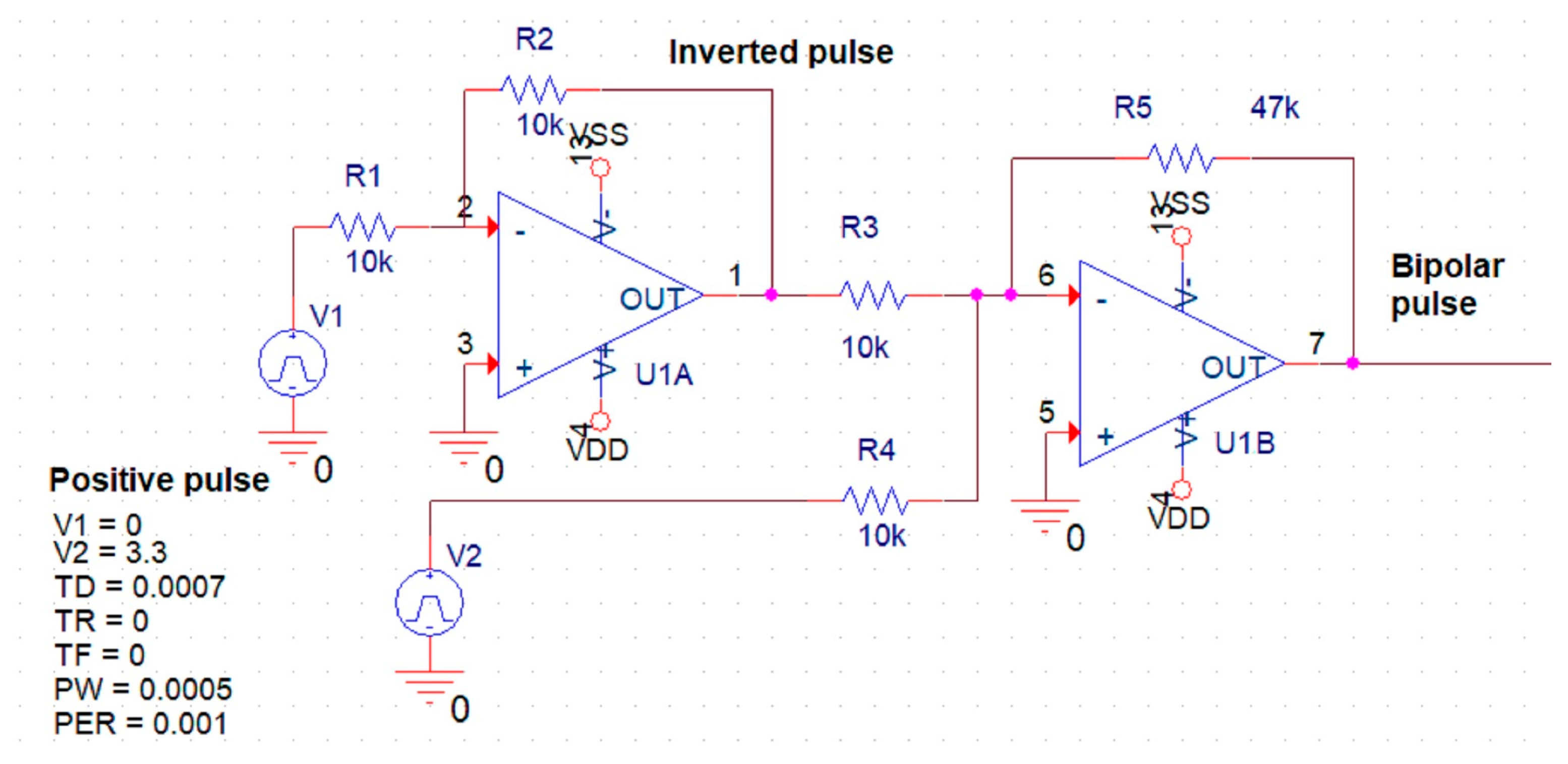 Figure 5 as source V1, is connected to an inverting amplifier (U1A) to change the polarity. The output of the second microcontroller (V2) is not inverted but has a time delay. Subsequently, the two pulses were directed to an inverting summing amplifier (U1B) to merge and amplify them to reach the highest possible potential (Equation (1)). (Supply voltages VSS = +7.8 V, VDD = −7.8 V)