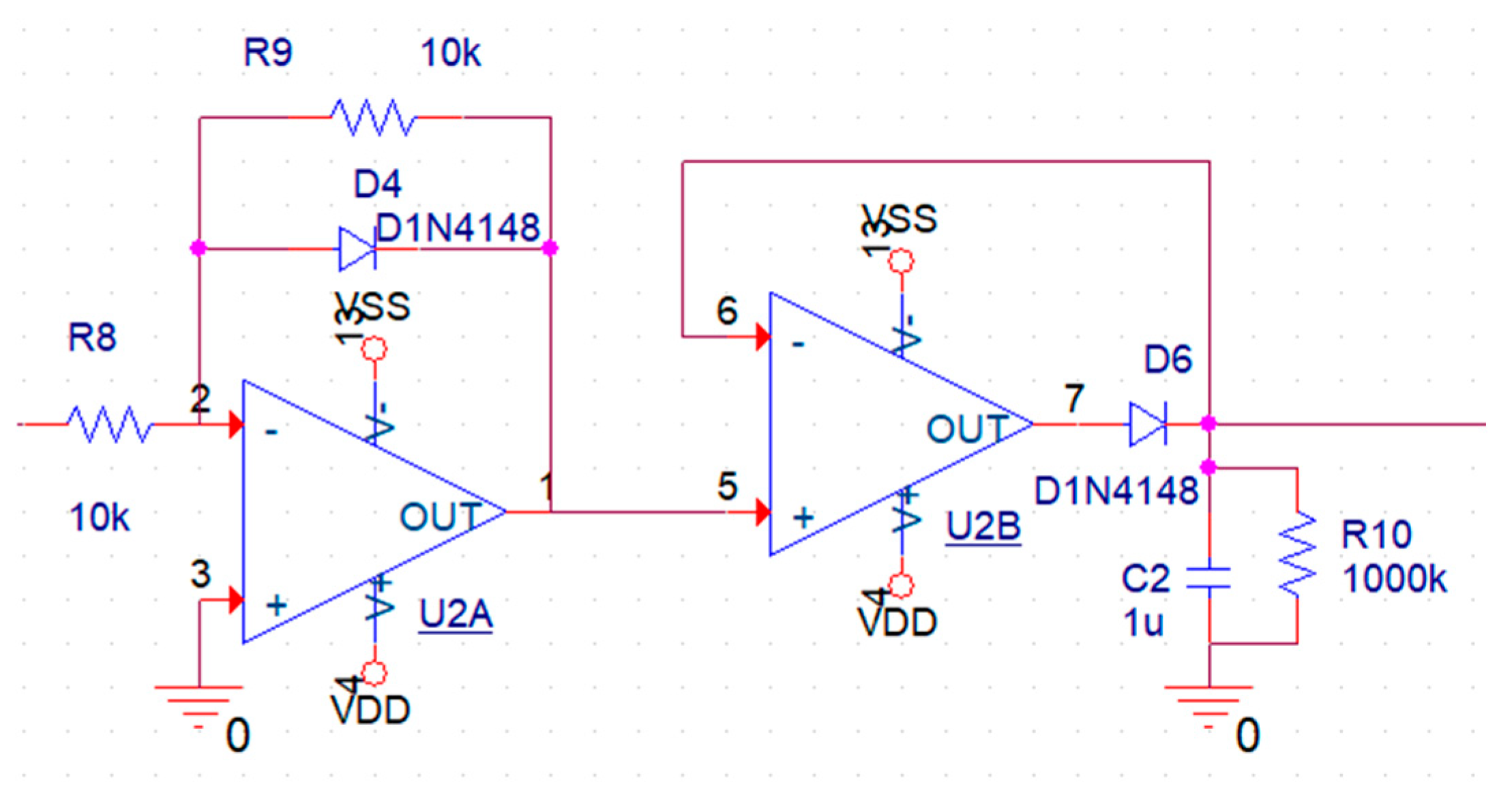 In the next stage, after estimating the soil resistance in the form of AC voltage pulses, it was necessary to convert the signal to DC for further processing. Therefore, a half-wave rectifier circuit with an operational amplifier was used to ensure high accuracy in the output voltage, as shown in