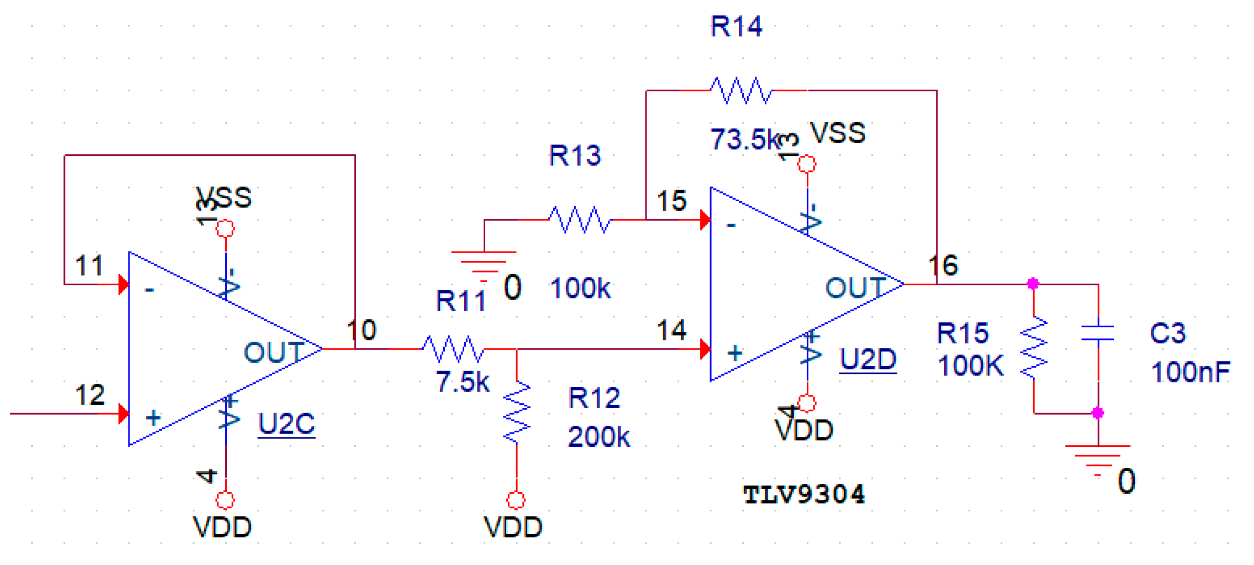This signal was fed into a low-pass filter, which was designed to attenuate high-frequency signals while allowing low-frequency signals to pass. The filter consists of a 1 kΩ resistor (R1) and a capacitor (C3).