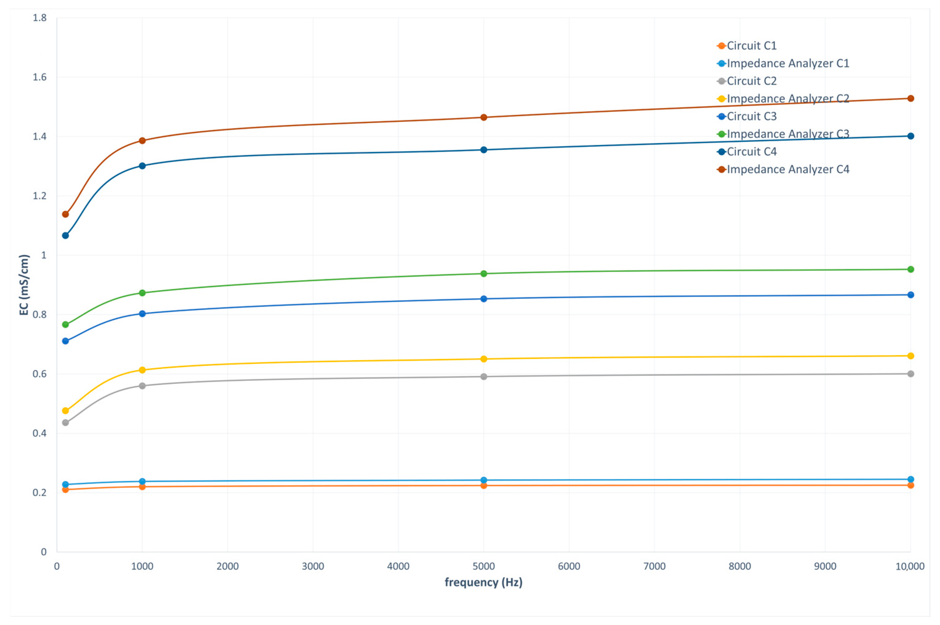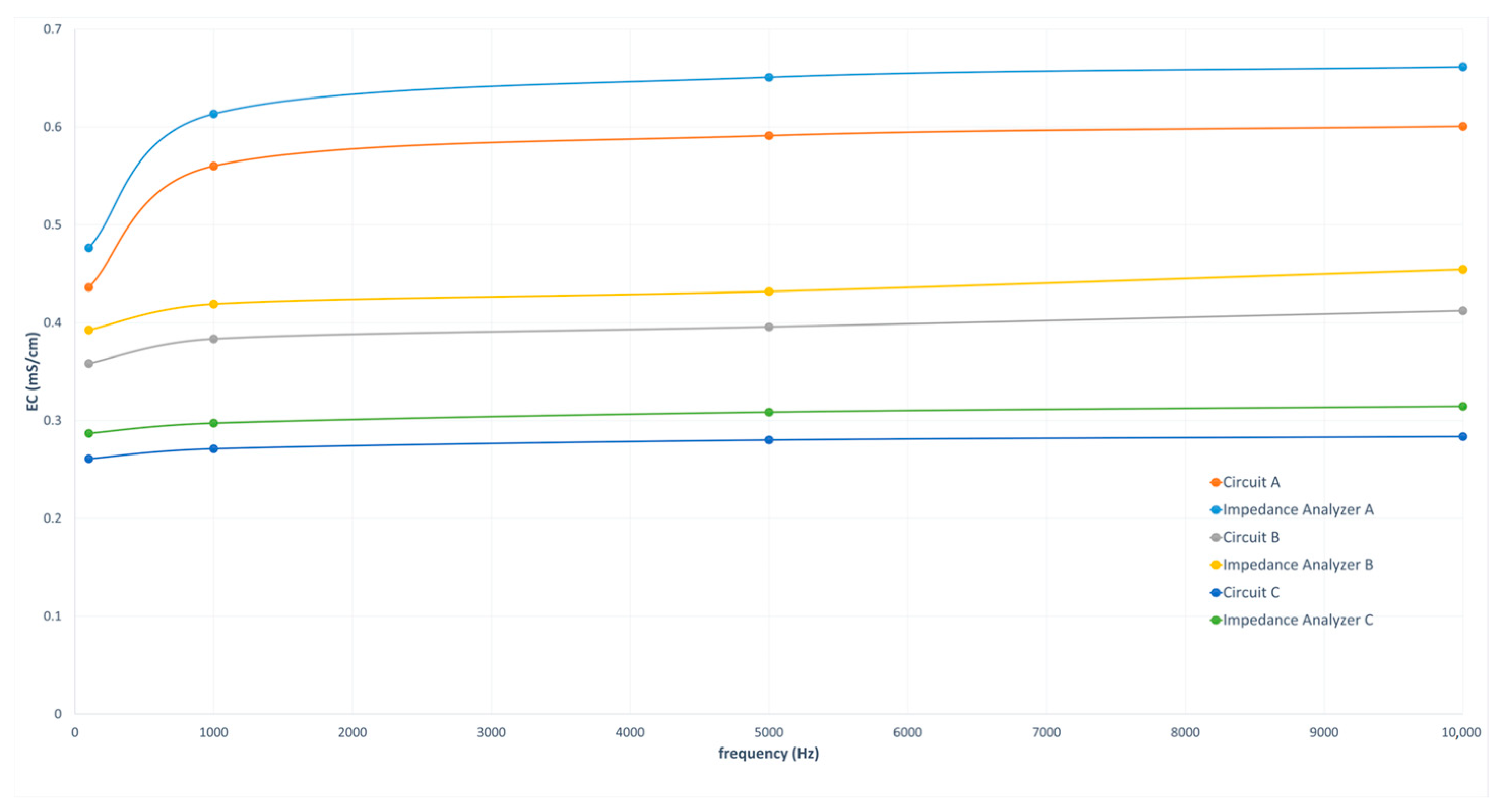 In all cases, EC increased with frequency, a trend consistently observed across all measurements, regardless of the instrument or dataset. The impedance analyzer generally reported higher conductance values than the developed circuit for the same datasets and frequencies, indicating a systematic discrepancy between the two instruments. Among the measurement sets, conductivity varied, with set A showing the highest values and set C the lowest, reflecting differences in salt concentration or other sample characteristics.