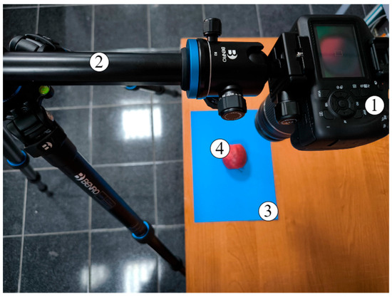 Figure 1. The setup is based on a Canon EOS 4000D digital SLR camera (Canon Inc., Tokyo, Japan) (1), a tripod with a horizontal bar Benro SystemGo Plus (Benro Image Technology Industrial Co., Ltd., Tanzhou Town Zhongshan City, China) (2), and a solid blue background (3), placed on a flat surface. This type of configuration is widely used in the construction of computer vision systems, digital sorting of agricultural products, and preparation of training samples for subsequent analysis. The camera with an EF-S 18–55 mm f/3.5–5.6 III lens shoots with a resolution of 18 megapixels, using an APS-C CMOS matrix (22.3 mm × 14.9 mm). To minimize distortion and ensure high detail, shooting was performed at a focal length of 55 mm. The camera was fixed strictly vertically on a horizontal rod of the tripod using a ball head and a quick-change plate. The shooting mode was set to Manual, with manual focus (MF) on the central area of the object. The exposure parameters were selected experimentally: an ISO sensitivity of 100–200 units to reduce digital noise; a shutter speed from 1/60 to 1/125 s; and an aperture of f/8 to ensure uniform sharpness throughout the depth of the object. The white balance was set manually using gray cardboard or the preset “daylight” setting (Daylight, 5500 K). The photos were taken in RAW format (for subsequent processing and analysis) and also duplicated in JPEG for quick viewing. The tripod with a horizontal retractable rod allows the camera to be fixed strictly above the object, ensuring stability and repeatability of the conditions. The adjustable height and rotation mechanism allow precise adjustment of the distance between the lens and the shooting surface, which, in this case, was about 50 cm. The tripod is equipped with a built-in level, which is used to correct the horizontal position of the camera and prevent distortion of the frame. A plain blue A4 background made of matte paper that does not create glare was placed on the working surface. The choice of blue color is due to its high contrast with the color of the fruits and the lack of intersections in the color spectrum with objects, which contributes to more accurate segmentation and subsequent processing of the image. The exact center of the frame was occupied by the studied object—in this case, an apple fruit. Each fruit was positioned in the same orientation with symmetry control, which ensures standardization of the photographic material. The scene was illuminated using diffuse daylight or a pair of LED sources with a color temperature of 5500 K and a color rendering index (CRI) of over 90. The light panels were positioned symmetrically on both sides at an angle of 45° to the surface, ensuring uniform illumination and minimizing shadows. This approach improves the visual highlighting of object contours and increases the accuracy of the parameters extracted during digital processing.
