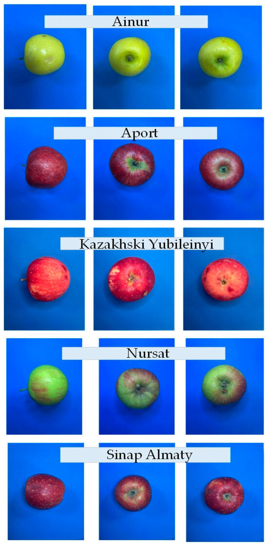 Stratified sampling of the apples was carried out to ensure representativeness and coverage of the variability of the entire population. The selected apple varieties included typical fruit specimens, taking into account the color, size, weight, and shape of each sample. Then, based on the main criteria of visual integrity, ripeness, and lack of defects, sample fruits were selected. A total of 250 fruit specimens were examined, 50 fruits from each variety, which corresponds to the required sample size to ensure statistical reliability at a significance level of α = 0.25.