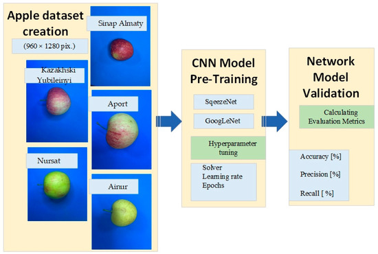 Figure 3). First, a sensor based on standard CCD technology is used to capture color images of apples with a resolution of 960 × 1280 pixels. The next stage involves building a test sample of images for each variety and training two types of deep learning networks, with different settings of the optimization algorithm, solver, and Initial Learning Rate. The third stage involves evaluating the performance of the networks and selecting the most suitable model. This is performed on the basis of three basic metrics for network evaluation, Accuracy, Precision, and Recall, which are calculated when identifying the variety of images from validation samples.