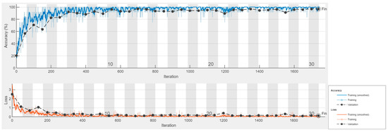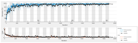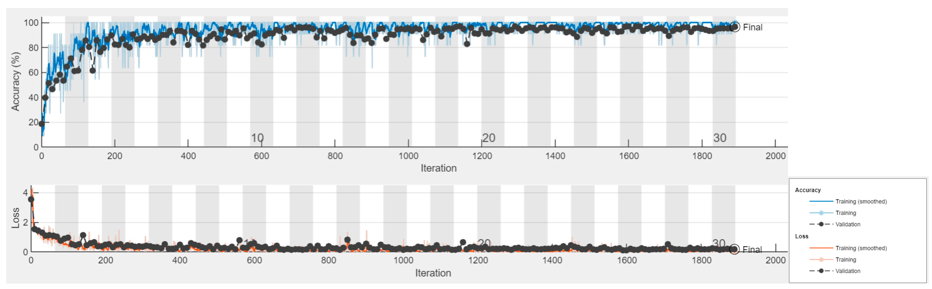 The models were trained for 30 epochs, with a validation rate of 50. Proportions of 70% and 30% of all images from all apple varieties were divided into training and validation sets, respectively, with the input image sets shuffled in each epoch with training and validation. Additionally, the input image sets were randomly augmented using the functions of the MATLAB Deep Network Designer application—the images were rotated with a random angle from −90 to +90 degrees and scaled by a random factor from 1 to 2. Augmenting the input sets allows the trained networks to be invariant to distortions in the image data.