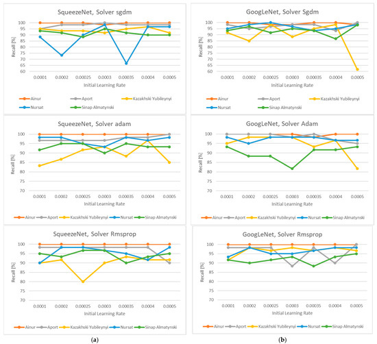 Figure 7b). According to the Recall indicator for SqueezeNet, the varieties Ainur and Aport are not sensitive to changes in the ILR. These two varieties are also not significantly affected by the SqueezeNet tuning algorithm. For GoogLeNet, Ainur, Aport, and Nursat are the varieties that are less sensitive to changes in the ILR, while Kazakhski Yubileyinyi and Sinap Almaty are affected to a greater extent by changes in the ILR. For GoogLeNet, the tuning algorithm has a slightly more pronounced effect on the Recall parameter values overall.