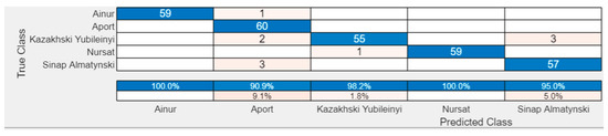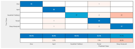 Figure 10 shows the matrix for SqueezeNet, with solver Sgdm and ILR = 0.00035, where the Precision for two of the varieties—Ainur and Aport—does not exceed 80 and 83.1%, respectively.