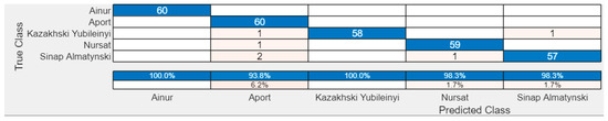 29]. When using Confusion matrices in tasks with more than two classes (multiple classes), the concept of “positive” and “negative” classes from binary classification is replaced by the multiple classes. In a multi-class confusion matrix, the results for the classified samples are interpreted in the following way: by the class to which each element is predicted to belong, by columns, and by rows depending on its true class. Thus, the diagonal elements contain those that were correctly classified (the predicted class coincides with the true class—True Positive), while the off-diagonal elements show the number of incorrectly classified elements. In a multi-class confusion matrix, it can be seen whether there are classes that are constantly confused with each other. In such a case, it would be advisable to train the network with additional samples from these classes in order to increase the overall accuracy.