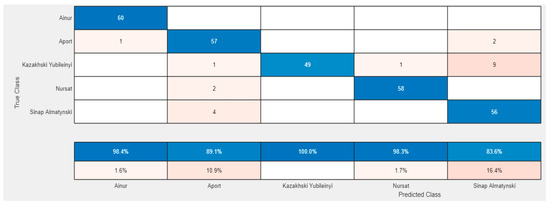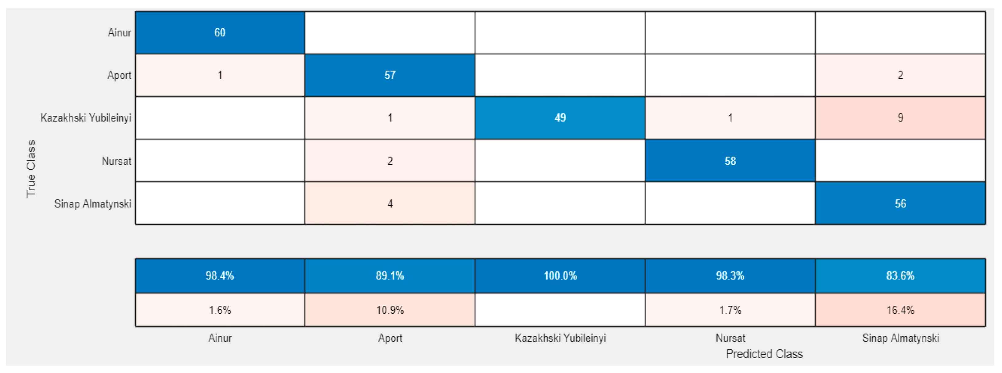 Figure 11), the low Validation Accuracy is mainly due to the poor recognition of the samples from the Sinap Almaty variety with only 73.10% Precision and from the Nursat variety with 92.20% Precision, while the recognition is good for the other three varieties. For GoogLeNet shown in