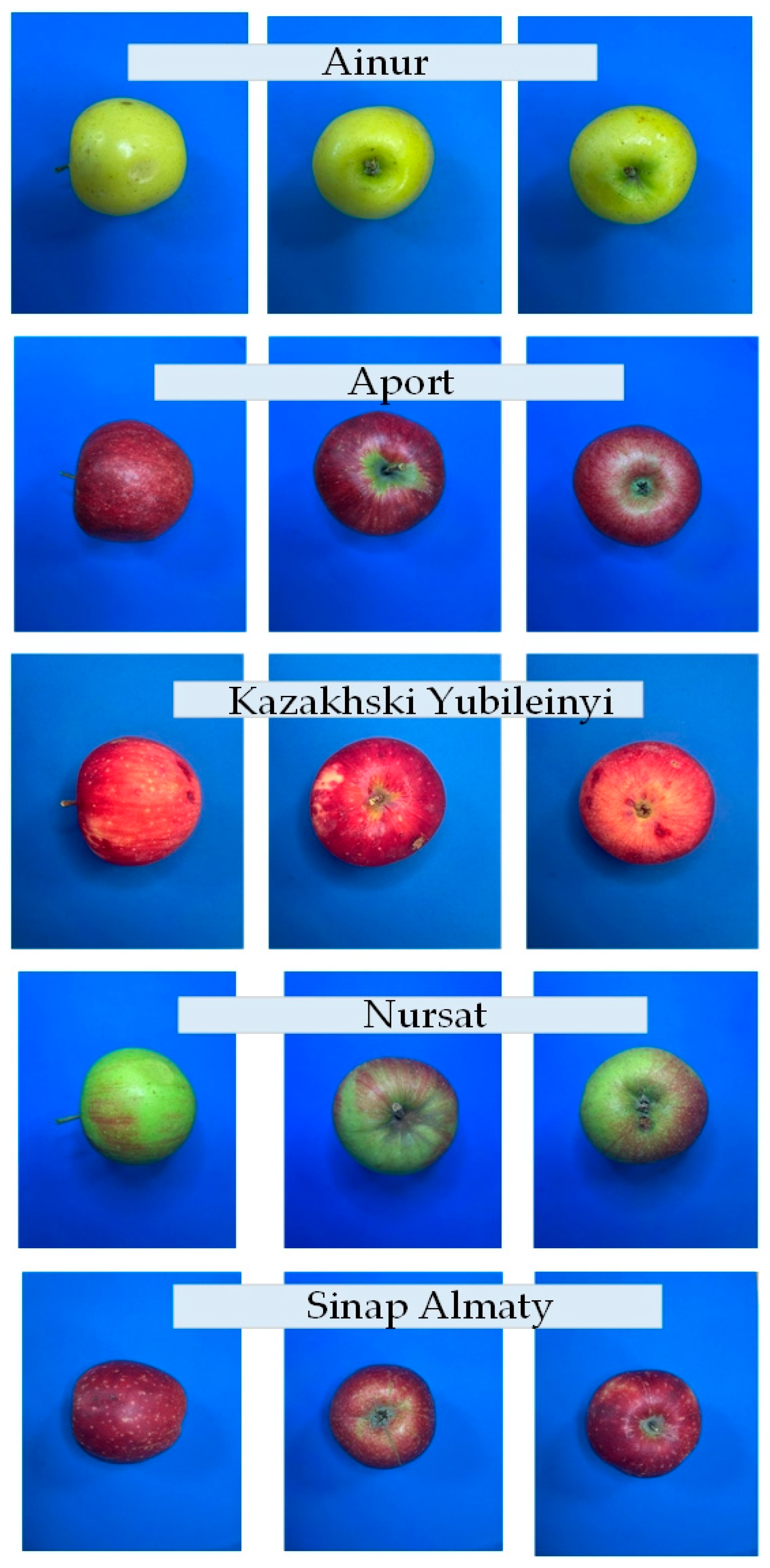 The objects of this study were five varieties of apples from Kazakhstan: Aport Alexander, Aynur, Sinap Almaty, Nursat, and Kazakhskij Yubilejnyj.