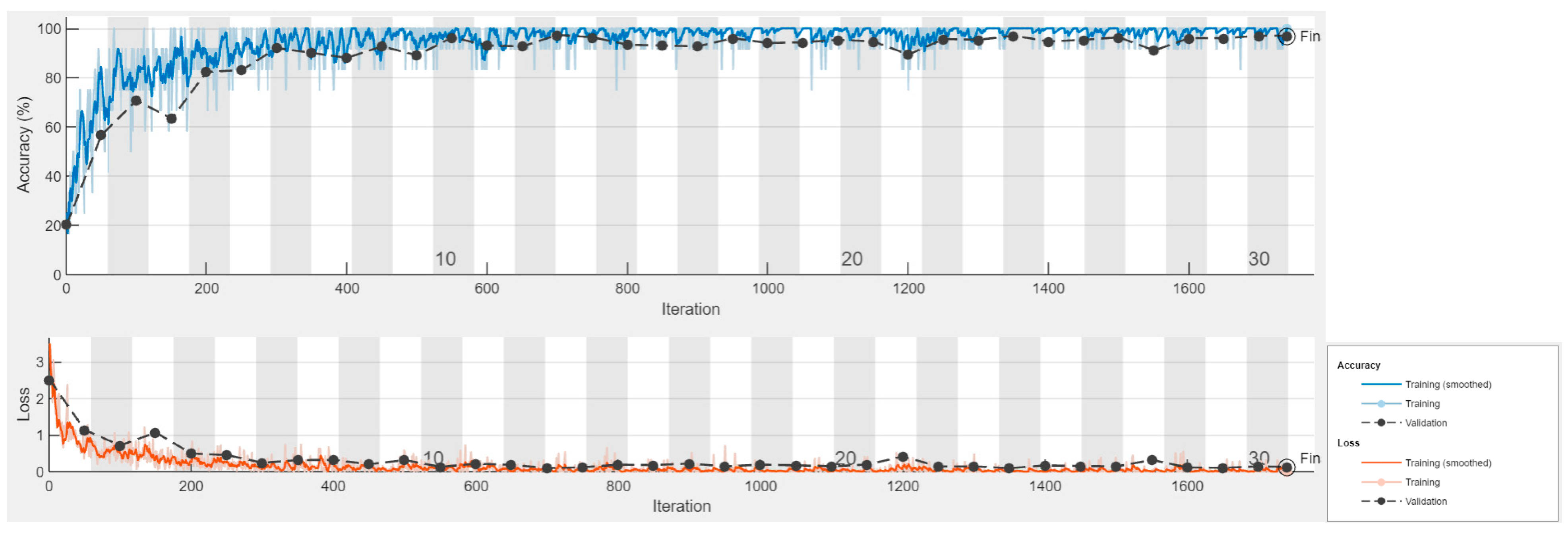 Figure 4 shows the training plots for SqueezeNet with solver Sgdm at an average change in ILR of 0.0003, and