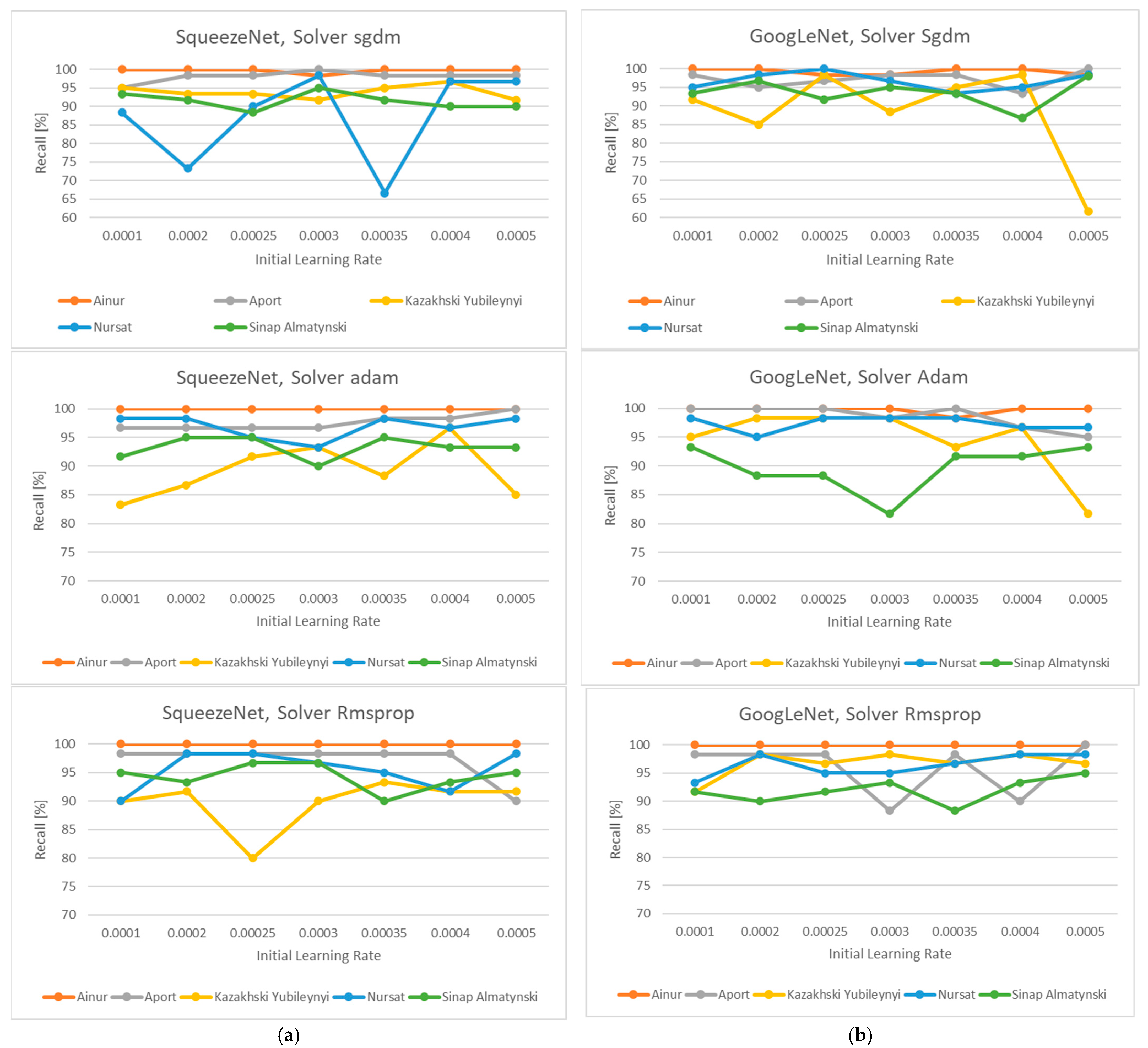 Table 3 systematizes and shows the values of the evaluation indicators of SqueezeNet and GoogLeNet using the selected best Initial Learning Rate settings for the three solver algorithms. In terms of Accuracy, the values vary between 97.67% and 100%. The highest accuracy is for the Ainur variety, 100%, with GoogLeNet and the Adam and RMSprop solvers, and the lowest, 97.67%, is for the Sinap Almatynski variety, with GoogLeNet and the Sgdm solver. For the Precision indicator, the values range from 90.9 to 100%, with the highest values of 100% obtained for the Kazakhski Yubileyinyi variety, with four variants and settings of the two networks, and the lowest obtained for the Aport variety. For the Recall indicator, the highest values of 100% are obtained for the Ainur variety with five variants and settings of the networks, and the lowest is obtained for the Kazakhski Yubileyinu variety. In general, higher accuracy is demonstrated when using GoogLeNet for all varieties.
