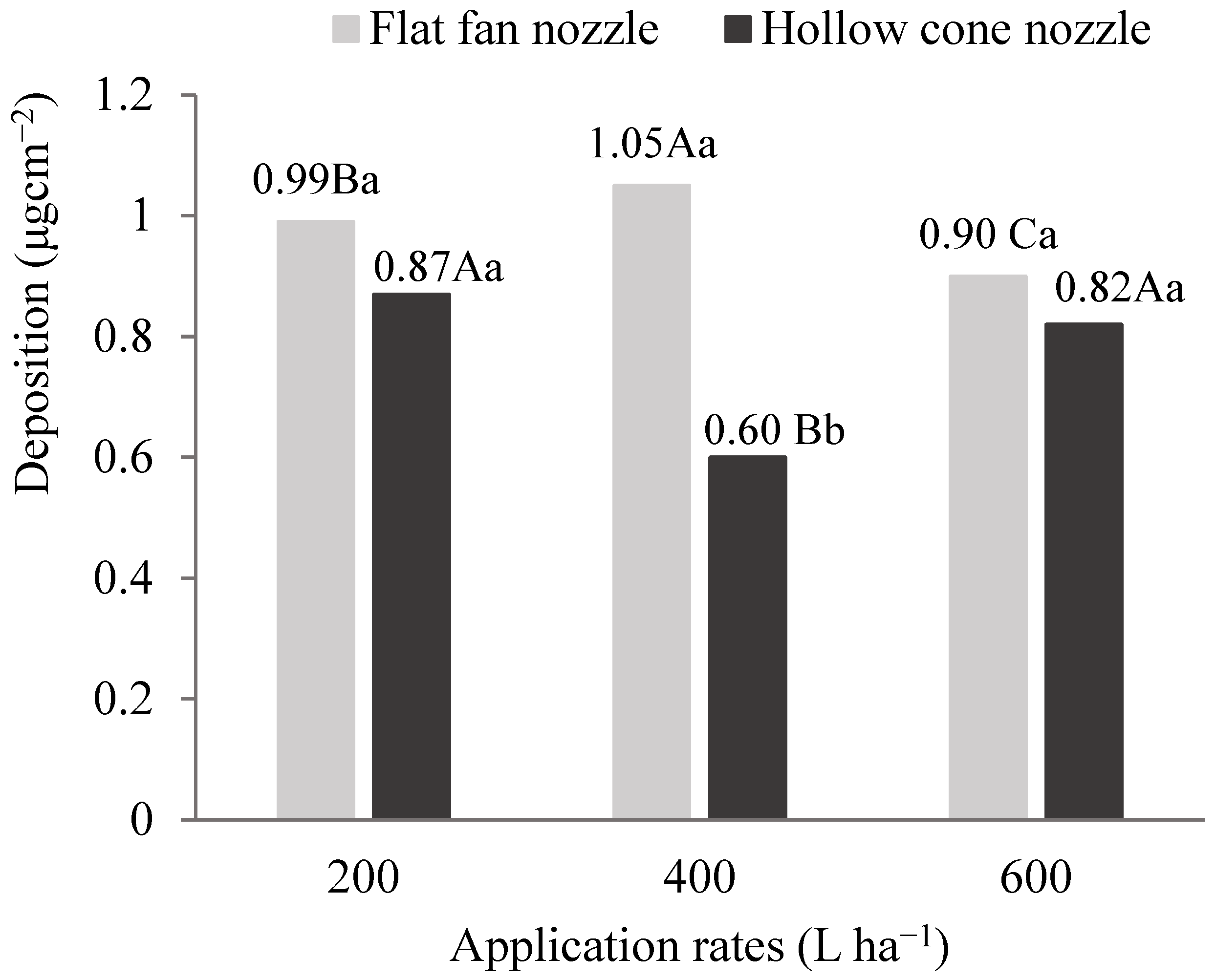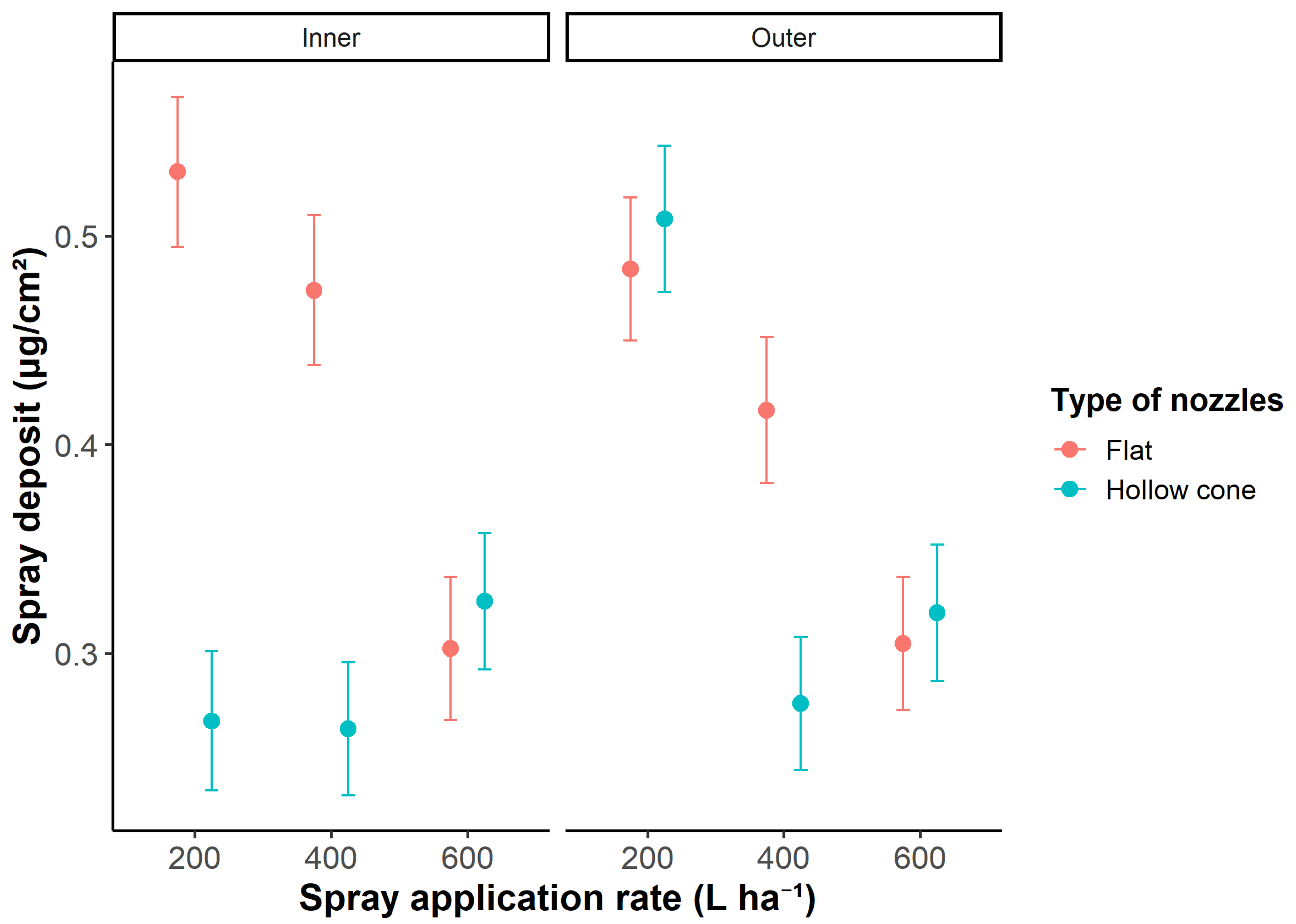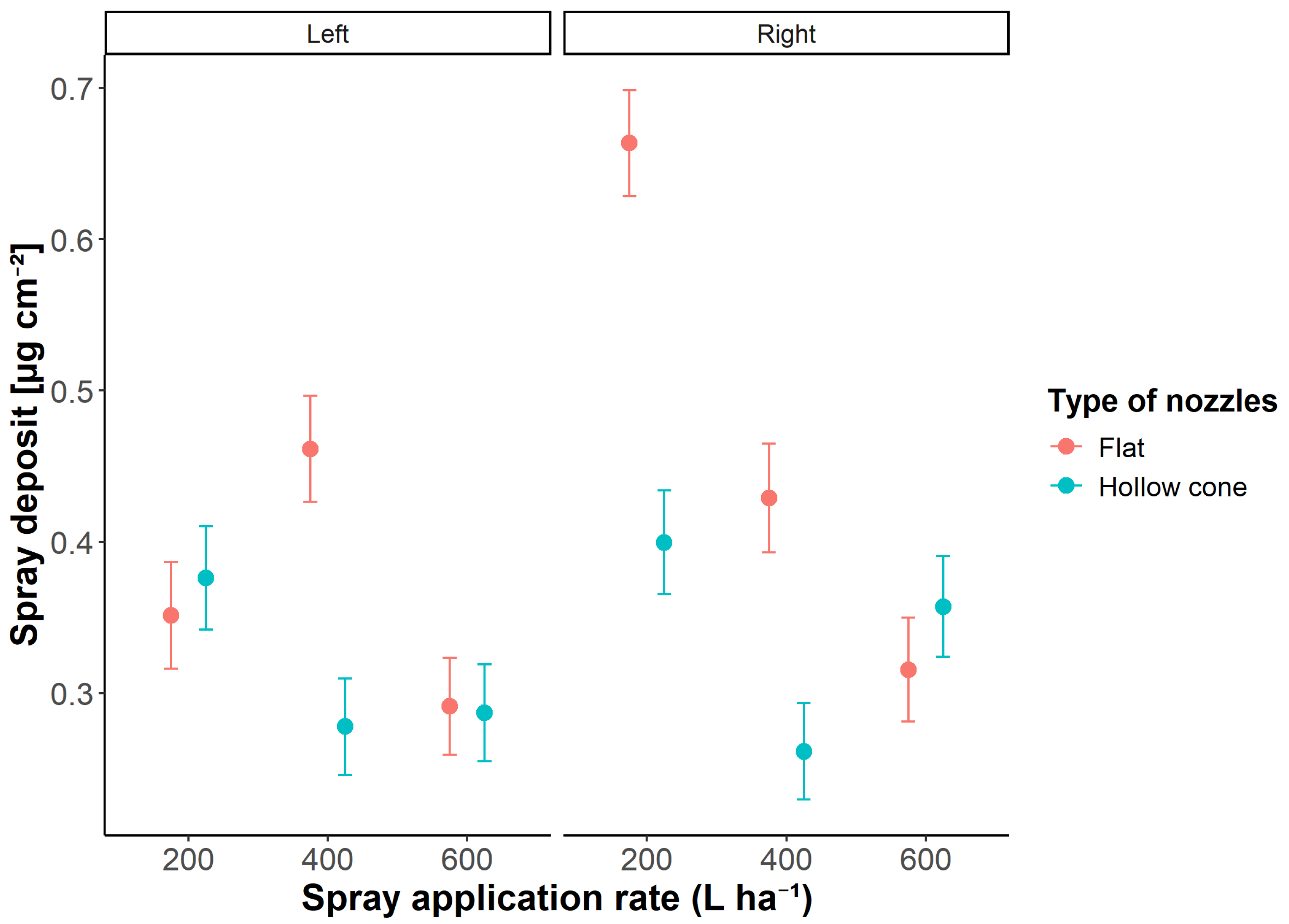 3.1. Deposition in the Reference Fraction Across Nozzle Types and Application Rates