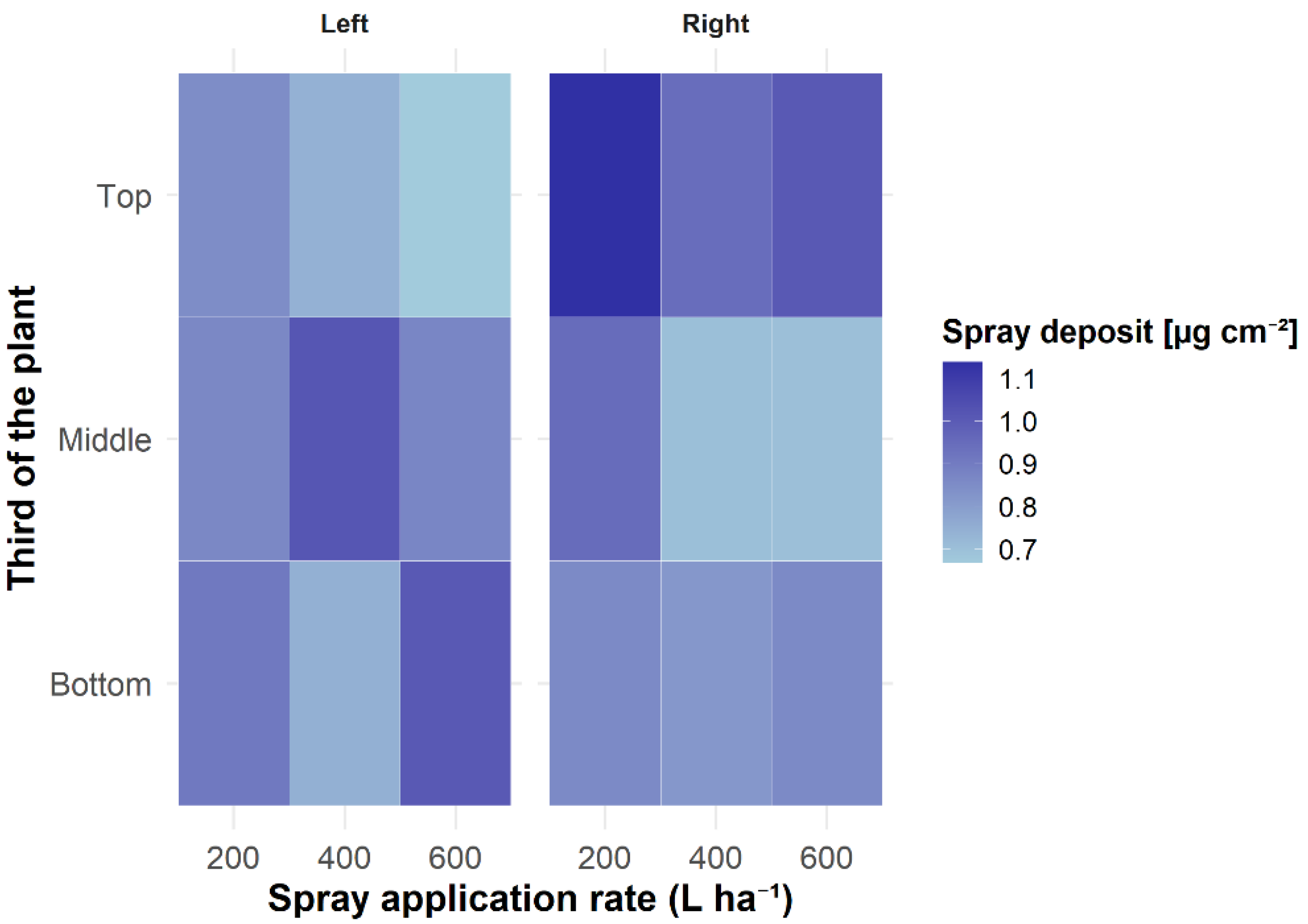 3.3. Deposition in the Reference Fraction as a Function of Application Rates in the Application Sides and Canopy Thirds