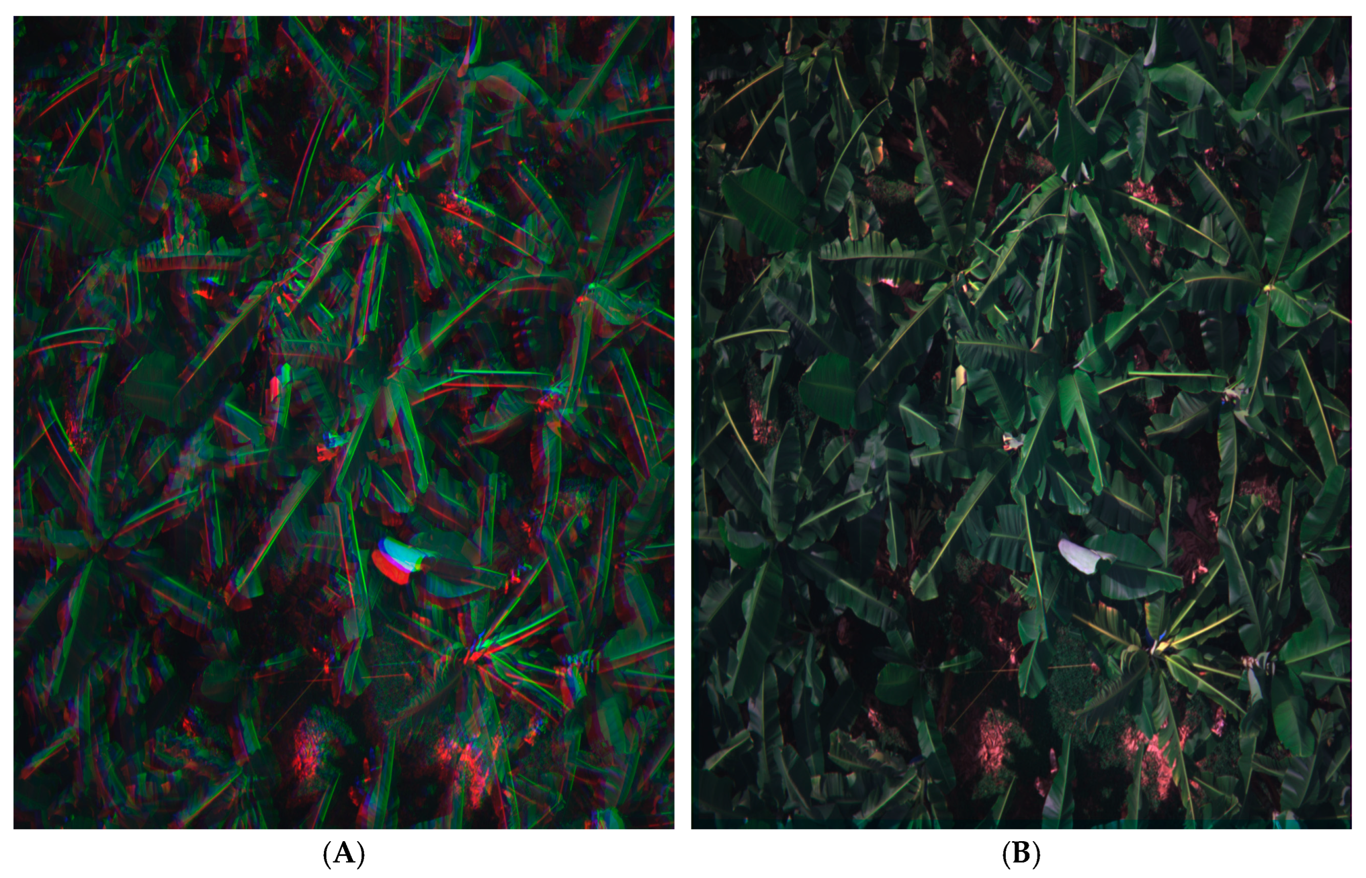 - Valdez, A.E.; Castañeda, M.A.P.; Gomez-Rojas, J.; Ramos, R.L. Canopy Extraction in a Banana Crop From UAV Captured Multispectral Images. In Proceedings of the 2022 IEEE 40th Central America and Panama Convention (CONCAPAN), Panama, Panama, 9–12 November 2022; IEEE: New York, NY, USA, 2022; pp. 1–6. [Google Scholar] [CrossRef]