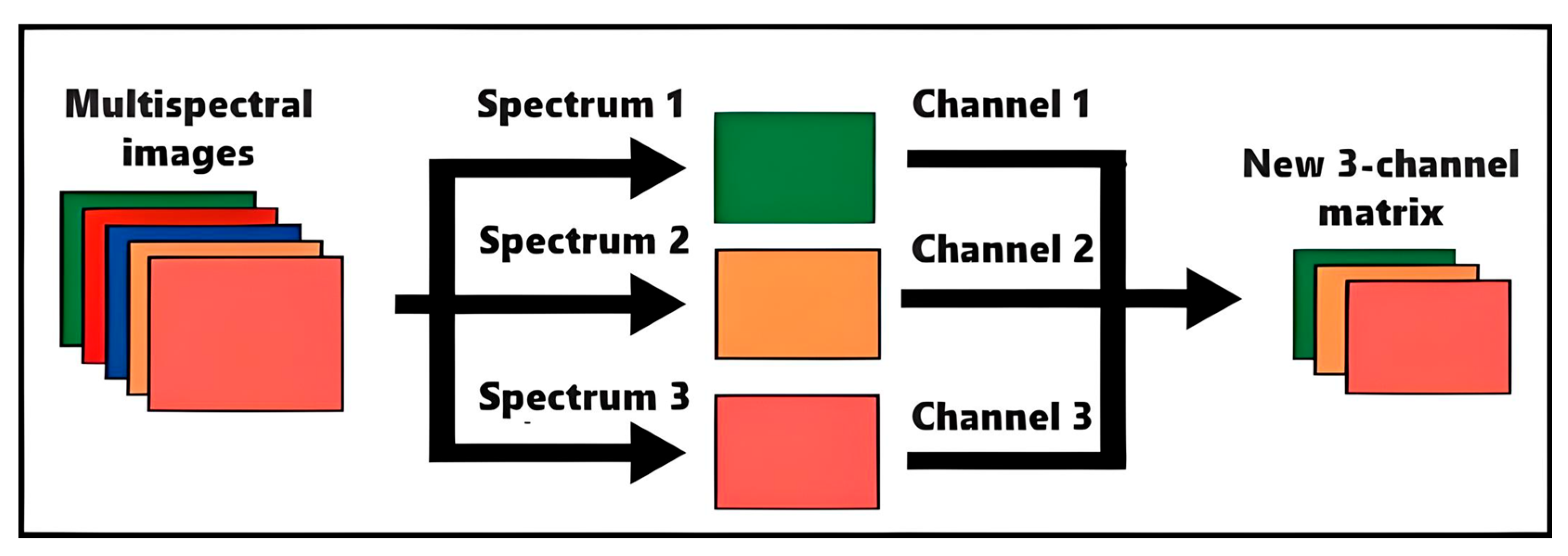 | Combination 3 | Blue 450 ± 16 nm | Red Edge 730 ± 16 nm | Near-Infrared 840 ± 26 nm | Highlights disease patterns by integrating blue spectrum with red-edge bands. |