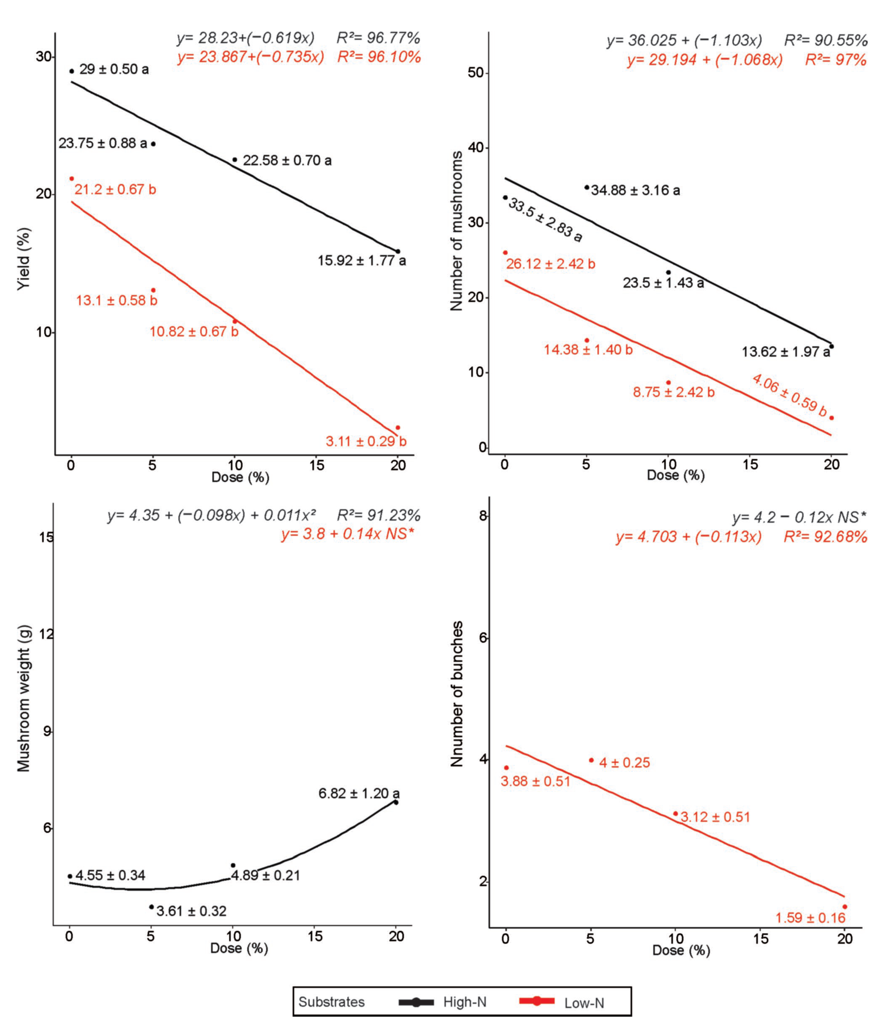 Substrates | Yield (%) | Mushrooms Number (u) | Mushroom Weight (g) | Number Bunches (u) |
