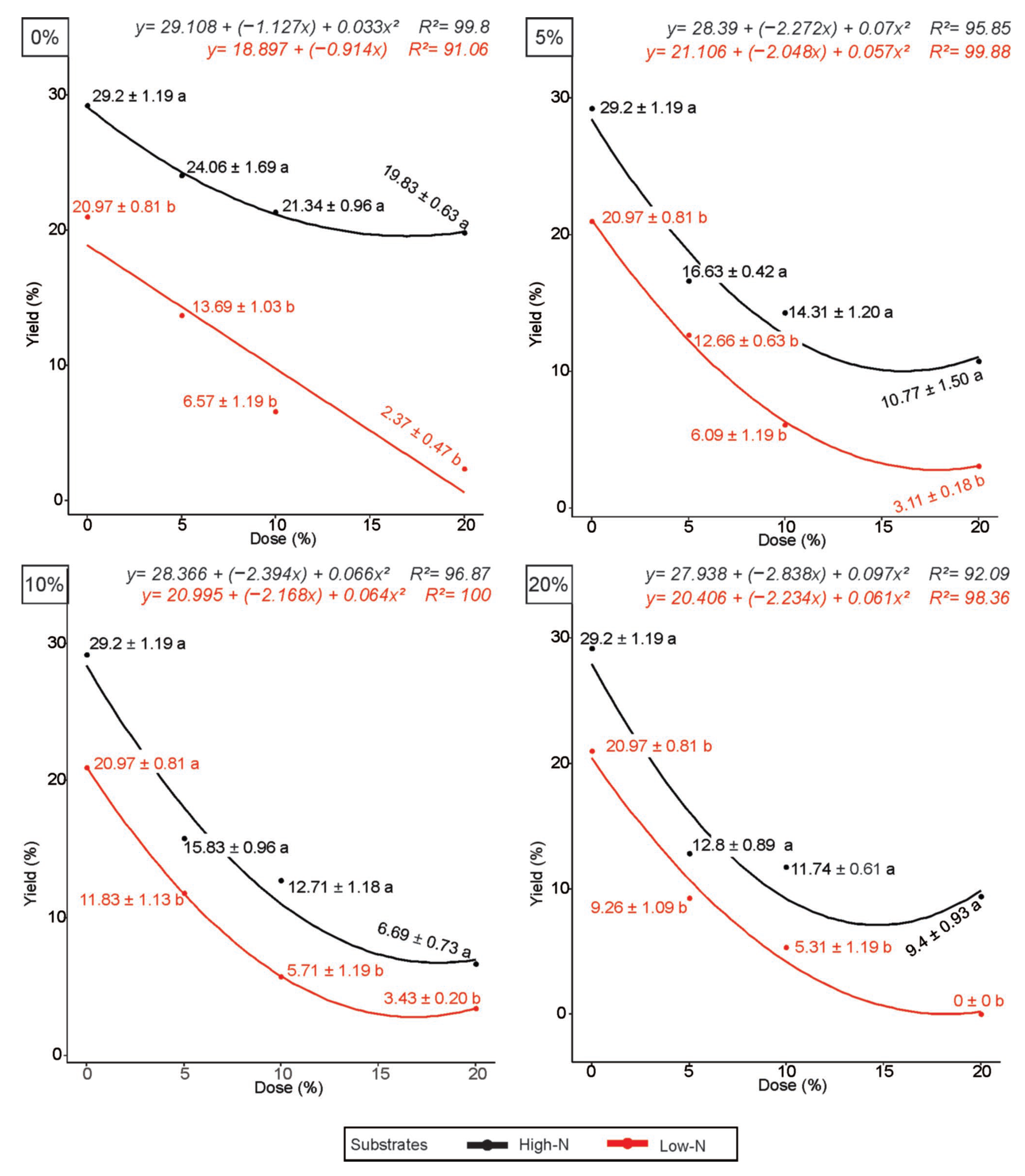 - Hřebečková, T.; Wiesnerová, L.; Hanč, A. Change in Agrochemical and Biochemical Parameters during the Laboratory Vermicomposting of Spent Mushroom Substrate after Cultivation of Pleurotus Ostreatus. Sci. Total Environ. 2020, 739, 140085. [Google Scholar] [CrossRef]