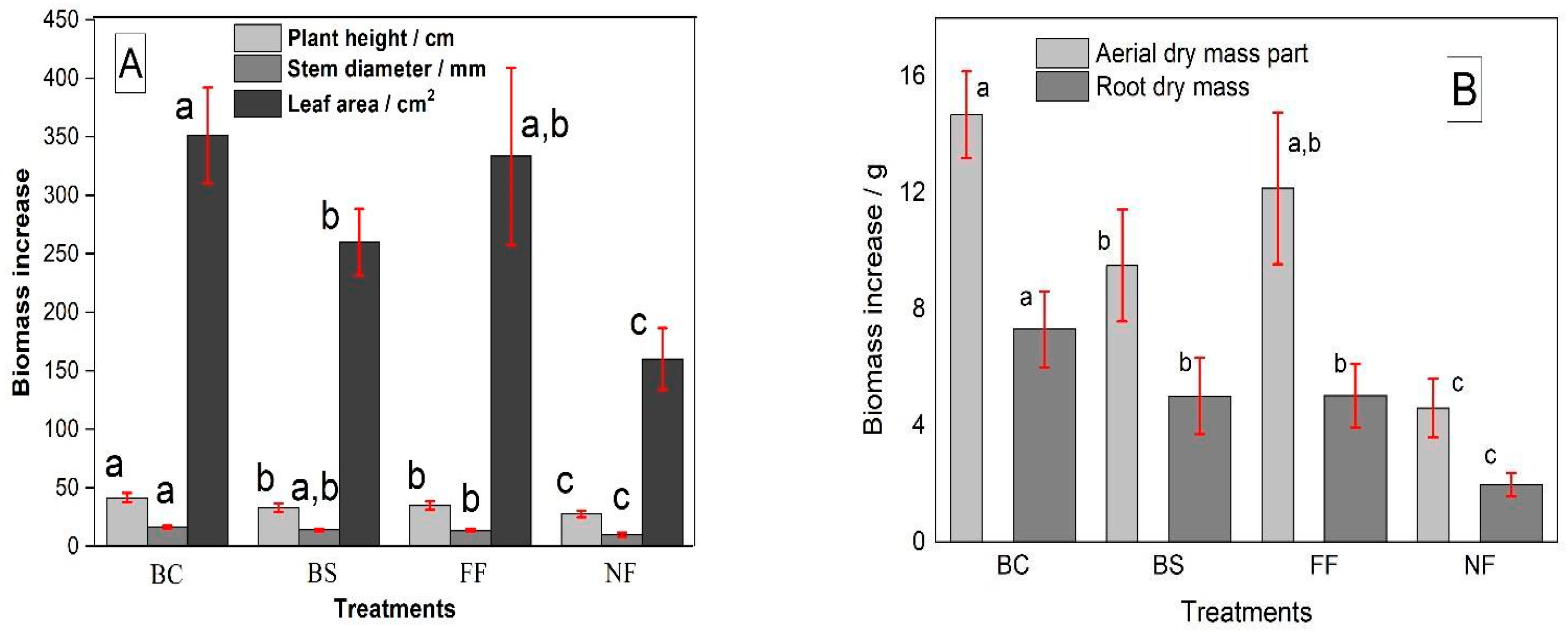3.3. Biomass Growth of Maize (Zea mays), Under Uncoated NPK and Ma-Trix-Based OMF Treatments
