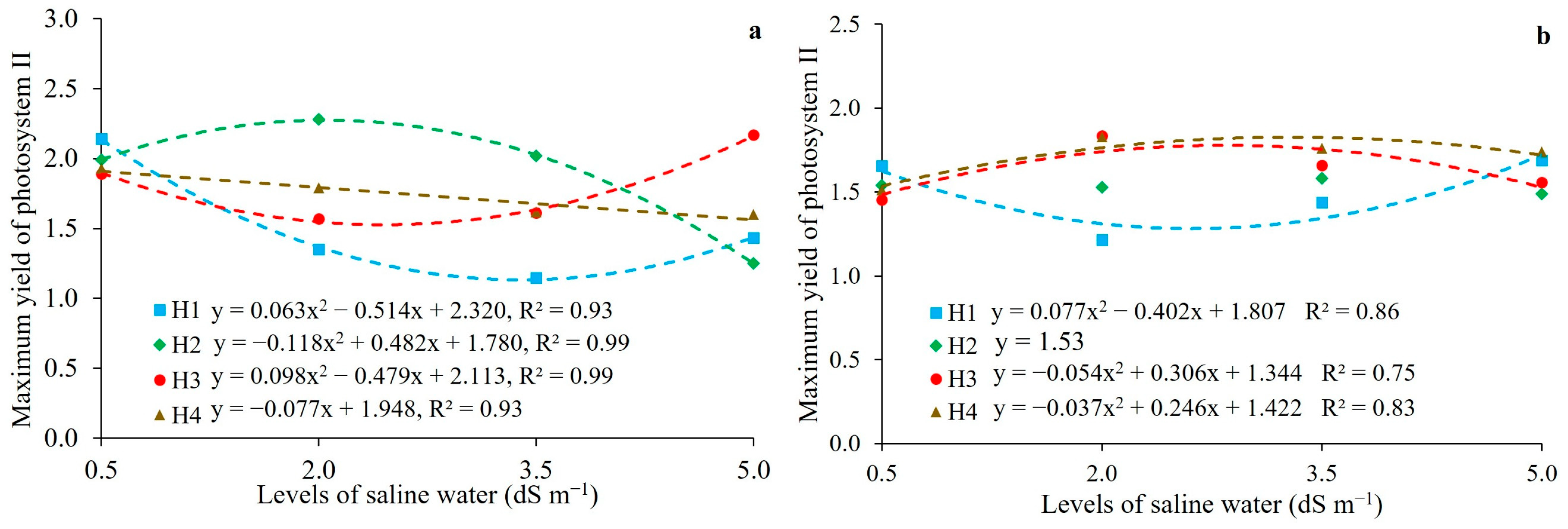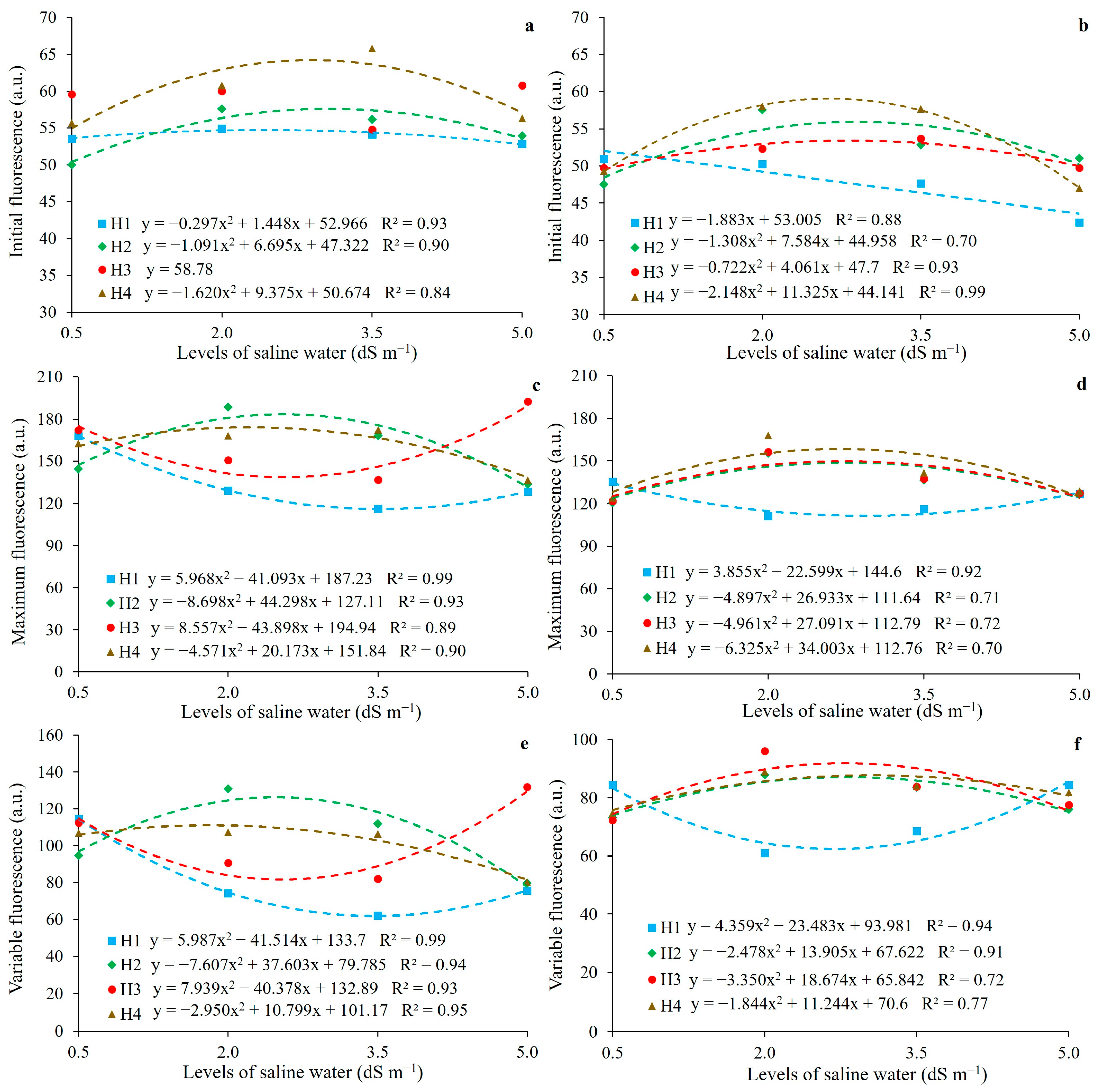 - Martins, J.B.; Santos Júnior, J.A.; Leal, L.Y.C.; Paulino, M.K.S.S.; Souza, E.R.; Gheyi, H.R. Fluorescence emission and photochemical yield of parsley under saline waters of different cationic nature. Sci. Hortic. 2020, 273, 109574. [Google Scholar] [CrossRef]