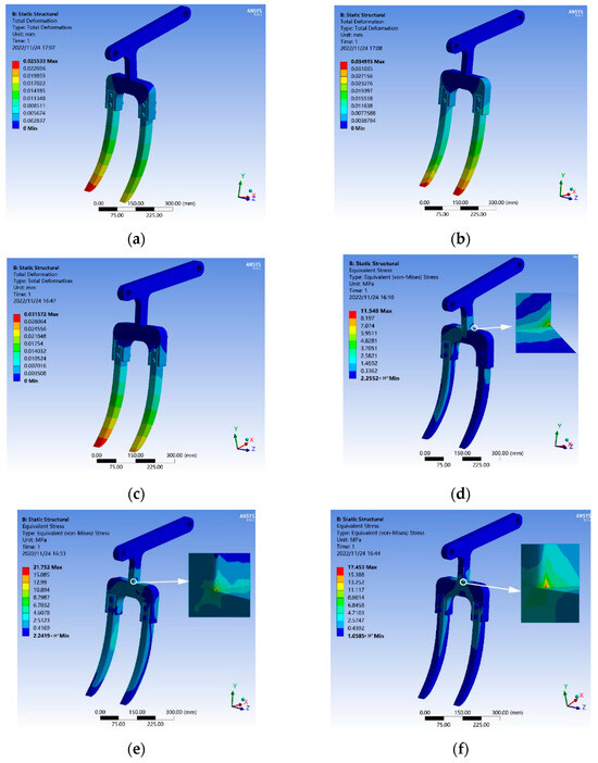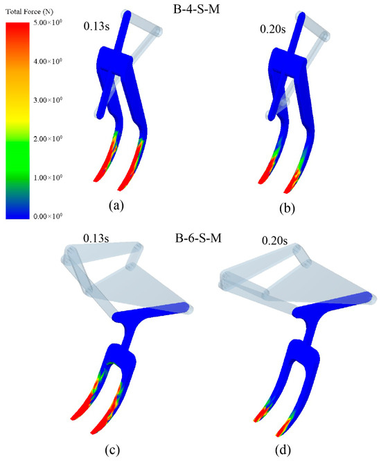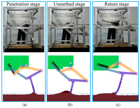 Figure 20 shows a comparison between the prototype test and simulation process of a six-bar subsoiling mechanism at three different times. The mechanism cuts into the soil, lifts the soil, and causes appropriate disturbance. When leaving the soil, some soil is excluded from the surface, and the simulation and experimental subsoiling process are basically consistent.