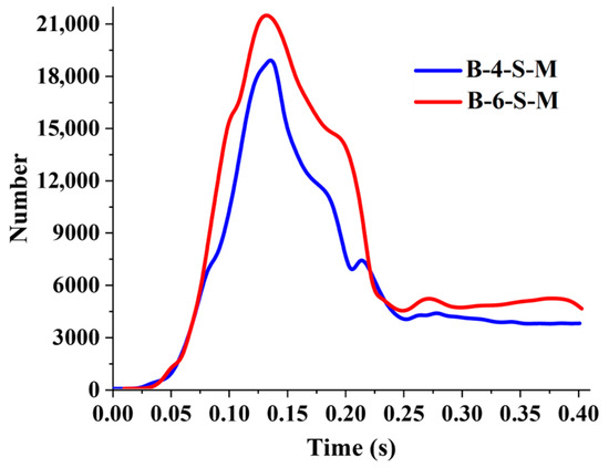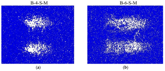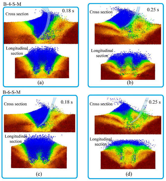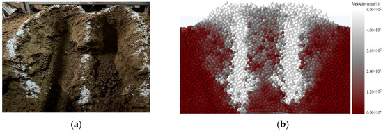 Figure 23 shows the comparison of the test results and simulation results of the soil disturbance situation. The disturbance range and soil discharge conditions of each soil layer in the test are basically consistent with the simulation results and conform to the analysis in