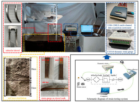 Dynamic changes in the tillage resistance of the subsoiler shovel were collected using strain gauges and a testing system. The testing system consists of hardware and software components. The hardware includes 120–100 AA strain gauges (with a resistance of 120 Ω and a sensitivity of 2) (Ningzhou Yinzhou Xiaying Chenyue Mechanical & Electrical Equipment Business Department, Ningbo, China), a CT5310 dynamic strain gauge (equipped with 10 channels), and a USB-1208LS multichannel data acquisition instrument (Shanghai Chengke Electronics Co., Ltd., Shanghai, China). The software component is the DAQmni 4.1 data processing software.
