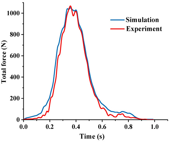 Figure 21 shows a comparison of the total tillage resistance curves between the experiment and simulation. The variation patterns of the two curves are consistent with the analysis in