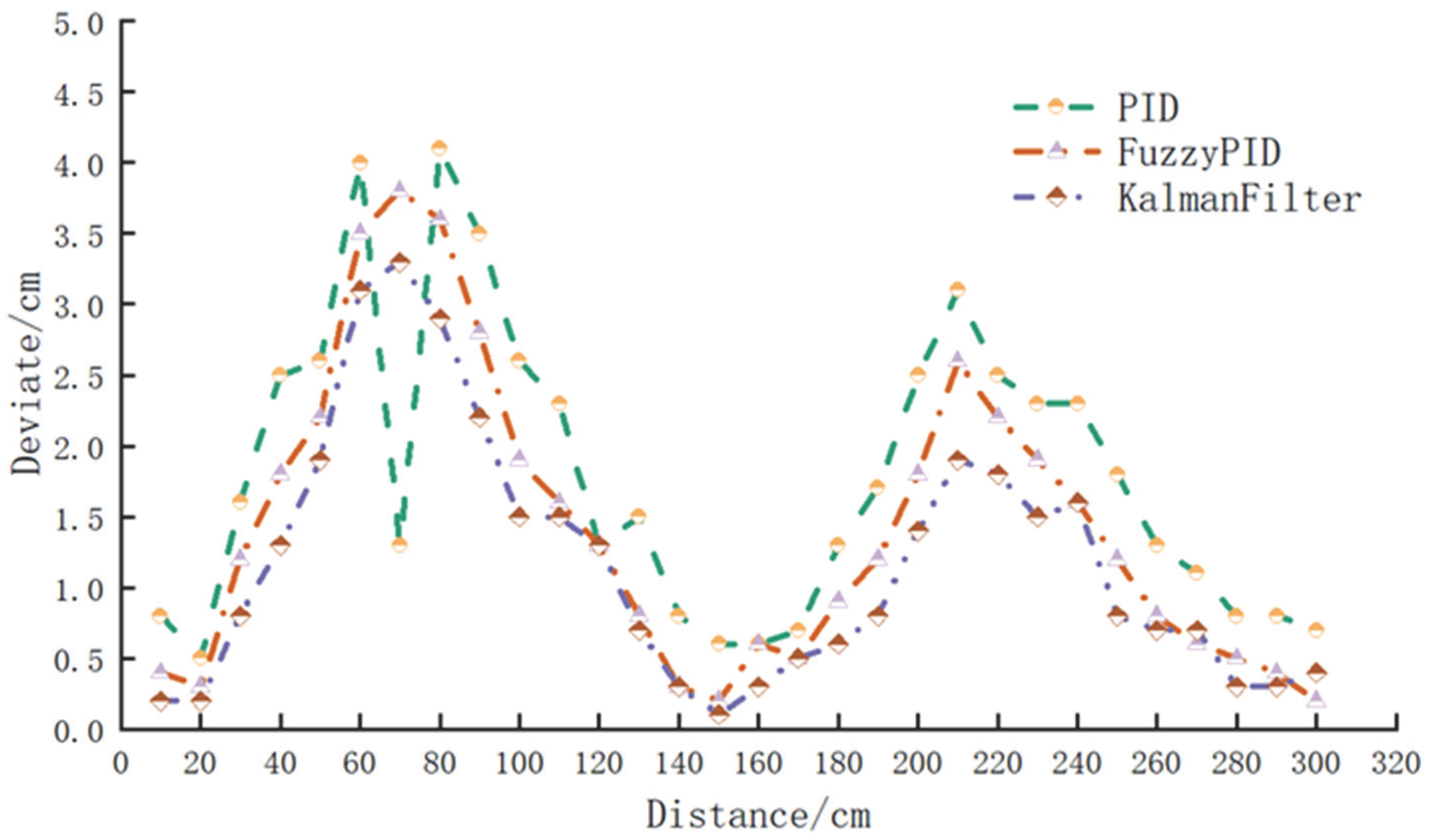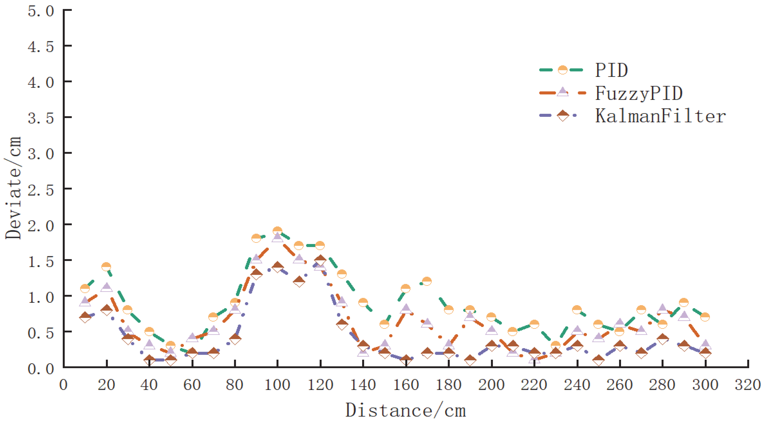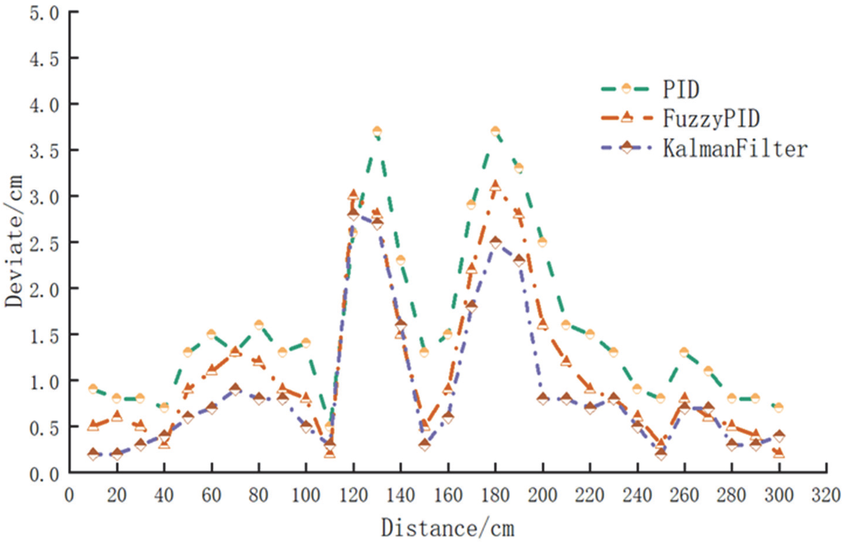 Measurement Point | PID Deviation | Fuzzy PID Deviation | Kalman Filter Deviation | Measurement Point | PID Deviation | Fuzzy PID Deviation | Kalman Filter Deviation |