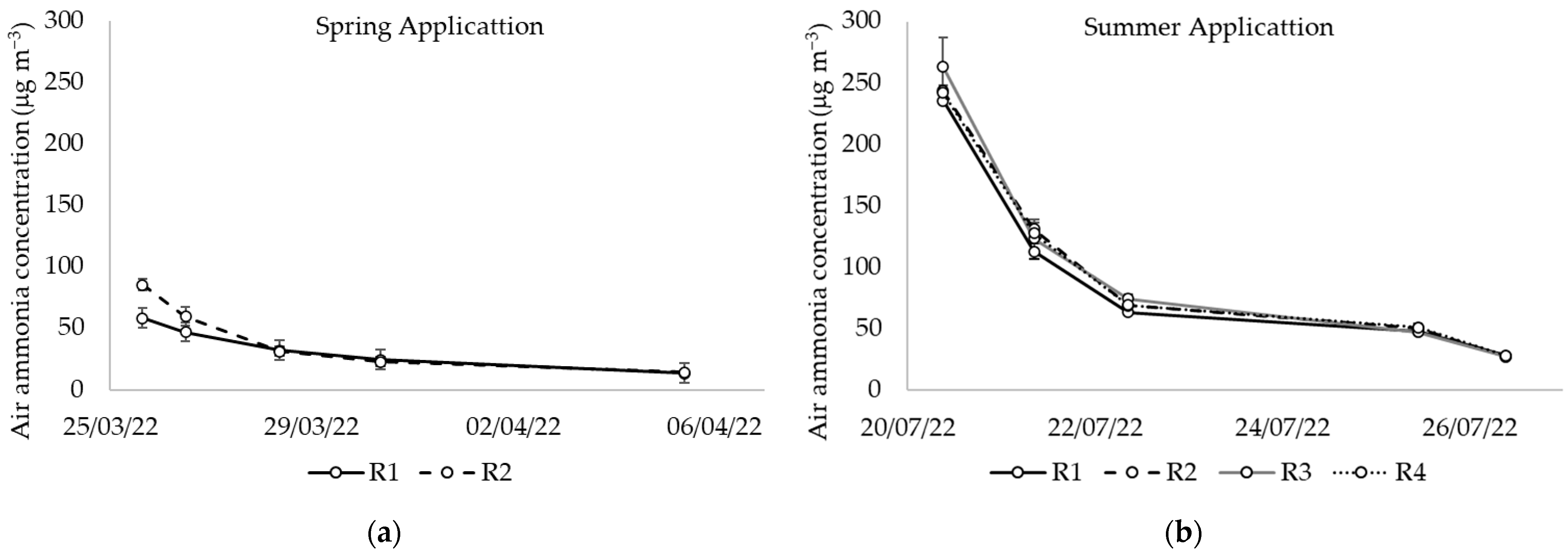 - Efosa, N.; Häni, C.; Kupper, T.; Krause, H.-M.; Six, J.; Bünemann, E.K. Ammonia emissions after trailing hose application of digestates and cattle slurry. Nutr. Cycl. Agroecosyst. 2025, 130, 419–426. [Google Scholar] [CrossRef]