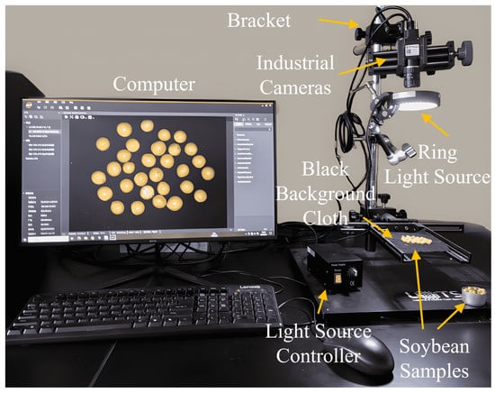 The soybean image acquisition platform mainly consists of an industrial camera, ring light source, light source controller, black background cloth, fixed bracket, and computer, as shown in Figure 1.