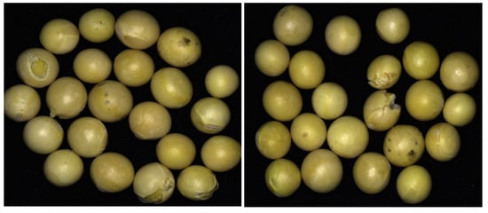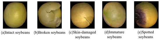 Soybeans are an important food and cash crop worldwide due to their high protein, high oil content, and excellent nutritional properties [1,2,3]. Normal, intact soybeans have high economic value and are mainly used in food processing, high-end feed, biofuels [4], and industrial raw materials [5]. Defective soybeans (such as spotted, immature or broken soybeans) are unsuitable for consumption and have low economic value, but can be used for low-end feed [6], industrial protein extraction, or biodiesel production after detoxification treatment. as well as composted into organic fertilizer [7] or used for biogas power generation, achieving resource utilization. Therefore, soybean testing and classification will have a certain impact on food processing [8,9], feed production, and breeding efficiency [10,11].