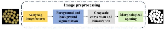 To enable the segmentation of individual soybeans, the collected images were preprocessed through a series of steps, including background removal, grayscale conversion, binarization, and morphological opening. The detailed workflow is illustrated in Figure 3.