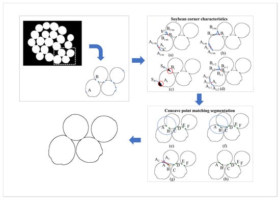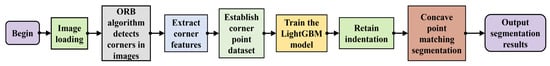 When segmenting images of multi-seeded sticky soybeans, corner points are first detected using the ORB algorithm as candidate points, as illustrated in Figure 6a,b. Subsequently, features such as vector angle, triangular vector area, black pixel area within the circular module, and first-order difference chain code are extracted for each corner point. These features are then input into a LightGBM machine learning model to distinguish concave points from non-concave points. Next, a concave point matching algorithm is applied to identify corresponding concave point pairs, and finally, the matched concave points are connected to complete the segmentation. The overall process is illustrated in Figure 6.