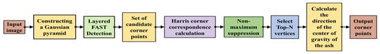 Building upon the FAST (Features from Accelerated Segment Test) algorithm, Rublee et al. [28] proposed the ORB (Oriented FAST and Rotated BRIEF) multi-corner detection algorithm, as shown in Figure 5. First, a Gaussian pyramid is constructed for the input image to enable multi-scale detection. Then, the FAST algorithm is run on each layer of the image, and candidate corners are quickly located by comparing the gray-level differences in pixel neighborhoods. Next, the candidate points are scored and sorted using Harris corner response values, and the optimal corners are selected through non-maximum suppression (NMS). Finally, the gray-level centroid direction is calculated for each corner point to ensure rotation invariance, and feature points with position, scale, and direction information are output. The entire process ensures detection efficiency while improving the robustness of feature points through a pyramid structure and direction compensation.