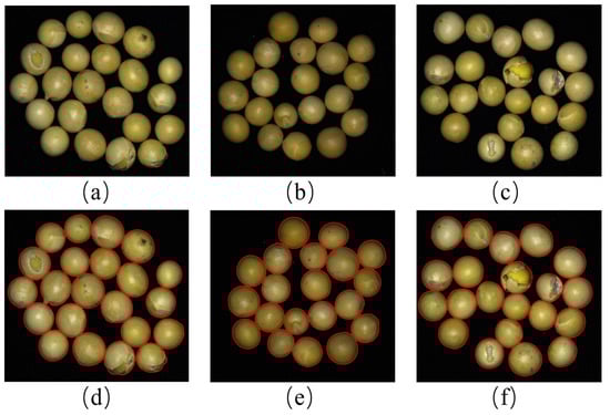 To validate the effectiveness and accuracy of the proposed soybean segmentation algorithm, three soybean images were randomly selected from the dataset for segmentation results, as shown in Figure 7. Figure 7a–c are the original soybean images, which include intact soybeans, broken soybeans, skin-damaged soybeans, immature soybeans, and spotted soybeans. Figure 7d–f are the segmented images (the outer contours of individual soybeans are indicated in red). Figure 7 demonstrates that the proposed segmentation algorithm achieves excellent segmentation results.