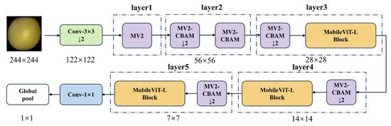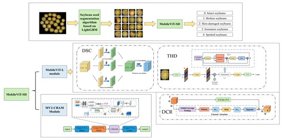 To achieve lightweight yet accurate soybean seed detection, this study proposes an improved model, MobileViT-SD (MobileViT for Soybean Detection). As illustrated in Figure 9, the model is primarily composed of stacked MobileViT-L and MV2-CBAM modules, designed for efficient detection and recognition of soybean seeds.