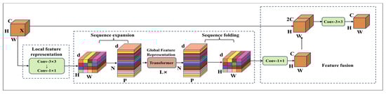 The MobileViT network primarily consists of the MobileViT module and the MV2 module [30]. The structure of the MobileViT module is shown in Figure 10, which enables lightweight visual representation learning through a structured cross-modal feature interaction process. In the initial stage, the MobileViT module receives an input feature map of size H × W × C. It first extracts local spatial features using a 3 × 3 convolution layer, followed by a 1 × 1 convolution to expand the number of channels from C to d. In the global modeling stage, the expanded feature map is unfolded into a two-dimensional sequence of size H × W with d-dimensional vectors, which is then fed into the Transformer encoder. Within the encoder, the multi-head self-attention (MHSA) mechanism models dependencies between sequence elements to capture global contextual information, while the feedforward network (FFN) enhances feature representation through nonlinear transformations. After processing, the sequence is reconstructed into spatial features of size H × W × d. A 1 × 1 convolution is then applied to reduce the number of channels from d back to the original dimension C, and the compressed features are concatenated with the module’s original input. Finally, a 3 × 3 convolution is applied for feature fusion to produce the final output feature map.
