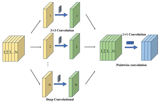 In the design of the MobileViT module, the standard 3 × 3 convolution used in the local feature extraction stage can effectively capture spatial features, but its parameter count and computational complexity increase quadratically with the number of channels. To address this, this study replaces the 3 × 3 convolution with depthwise separable convolution (DSC) [32]. Through multi-level structural decomposition and sparsity design, the model achieves significant compression of computational complexity while maintaining feature expression capability, thereby reducing the number of parameters in the model.