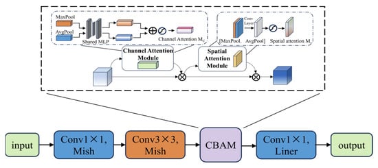 The channel attention module uses average pooling and max pooling to extract channel statistical information, combines it with a shared MLP to generate channel weights, and completes channel importance calibration to highlight key feature dimensions. The spatial attention module fuses channel-direction pooled features with convolution to generate spatial weights, outputting features that optimize channel and spatial positions. Therefore, by introducing the CBAM mechanism into MV2 and replacing ReLU6 with Mish, the MV2-CBAM module is formed, as shown in Figure 15.