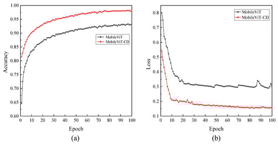 Figure 17a,b present the accuracy curves on the validation set and the loss curves on the training set for the MobileViT and MobileViT-SD models, respectively. As shown, compared with MobileViT, MobileViT-SD not only achieves a notable improvement in accuracy but also exhibits a clear reduction in loss values. These results indicate that the proposed improvements and optimizations have significantly enhanced the detection performance of the MobileViT-SD model.