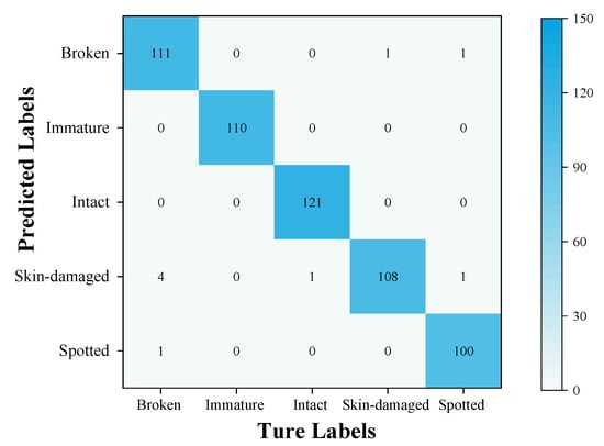 To further validate the generalization capability and robustness of the MobileViT-SD model, soybean classification performance on the validation set was analyzed using a confusion matrix, as illustrated in Figure 18. The model successfully identified 100% of the immature and intact soybean samples. Misclassifications were limited to a single instance of a spotted bean being incorrectly labeled as a broken bean, two instances of broken beans being misclassified, and five instances of skin-damaged beans being misclassified. The overall detection accuracy reached 98.38%, indicating that the MobileViT-SD model exhibits excellent generalization ability and robustness in soybean classification.