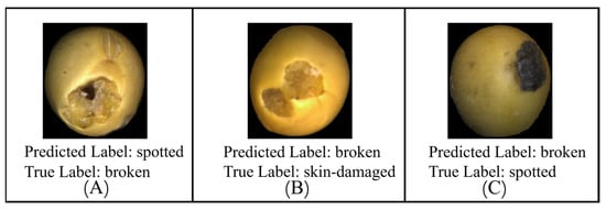 Examples of misclassified soybeans. (A) Predicted Label: spotted, True Label: broken (B) Predicted Label: broken, True Label: skin-damaged; (C) Predicted Label: broken, True Label: spotted.