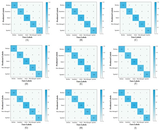 Confusion matrices for each model. (A) Vgg16, (B) ConvNeXt, (C) ResNet50, (D) EfficientNetB0, (E) MobileNetV2, (F) MobileNetV3, (G) ShuffleNetV2, (H) MobileViT-XXS, (I) MobileViT-SD.