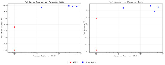 We benchmarked MCP-X against a range of convolutional neural networks (CNNs) and transformer-based models, as shown in Figure 5. MCP-X attained a validation accuracy of and a test accuracy of , outperforming several baseline CNNs, such as VGG-19 ( test accuracy) and AlexNet ( test accuracy), and achieving competitive performance relative to deeper models like ResNet152V2 ( test accuracy) and MobileNetV2 ( test accuracy). Specifically, MCP-X’s test accuracy is only 0.08% lower than MobileNetV2, representing a minimal trade-off given the 16.7 parameter reduction. Furthermore, under identical experimental settings (same dataset split, training protocol, and hardware), we compared MCP-X with other lightweight models (e.g., EfficientNet-Lite, GhostNet, and MobileNetV3). These unified-protocol comparisons support MCP-X’s parameter-efficiency trade-off.