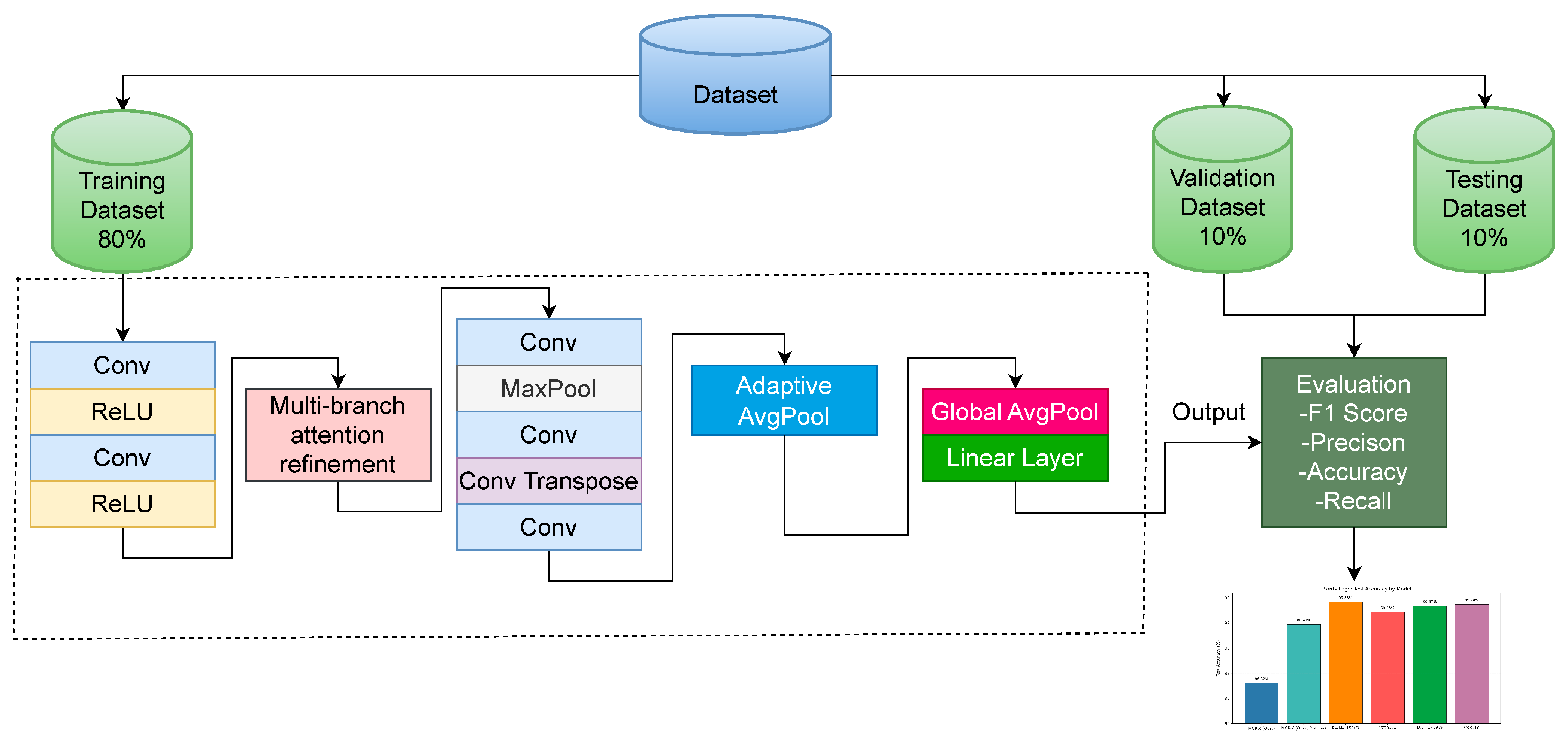 To ensure fair comparisons with popular lightweight baselines (EfficientNetV2, ShuffleNetV2, GhostNetV2), we standardize the following: (i) identical 80/10/10 split and image size 224 × 224; (ii) the same training schedule (optimizer, LR, batch size, early stopping), no external pretraining unless explicitly reported; (iii) unified runtime profiling (FLOPs via ptflops, peak memory via torch.cuda.max_memory_allocated, FPS with warmup + averaging, batch = 1, FP32); (iv) report Params/FLOPs/FPS alongside accuracy and macro-F1; (v) unless otherwise noted, all compared lightweight baselines undergo matched Optuna hyperparameter search spaces and budgets with shared random seeds and early stopping policy. Full HPO configs and logs are released for reproducibility.